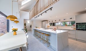 The heart of the home is undoubtedly the expansive living, dining, and kitchen space. Here, a bespoke ash gallery overlooks the room, while floor-to-ceiling windows and triple sliding doors frame views of the private, wrap-around garden with its protected mature trees. Every detail of the kitchen has been considered: soft-close cabinetry, a quartz waterfall island with an integrated Bora induction extractor. This space features NEFF appliances including double ovens, a full heigh fridge and an integrated dishwasher. The striking landscape letterbox window above the sink perfectly frames the tranquil setting, bringing the outdoors in.