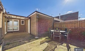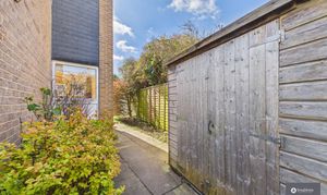 Outside, the rear garden offers a lovely private space to relax and entertain. A generous patio area sits immediately behind the property, perfect for outdoor dining, while the lawned section to the side is bordered by established shrubs and planting. Covered areas provide useful storage, and there is also a personal door giving direct access to the garage.