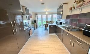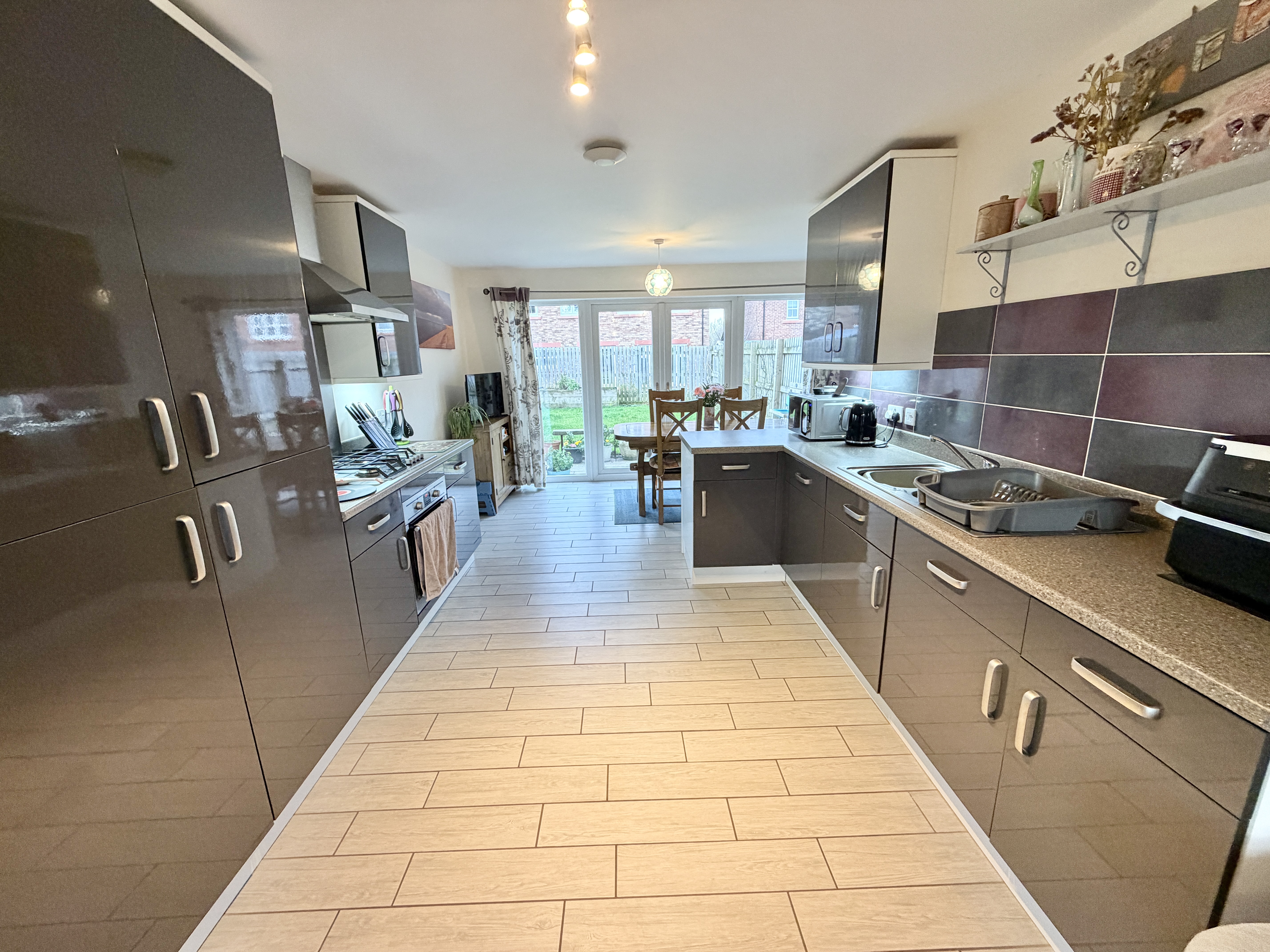 Integrated fridge freezer, dishwasher and washer dryer, gas hob and electric oven. French doors leading out to the rear garden.