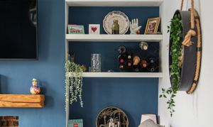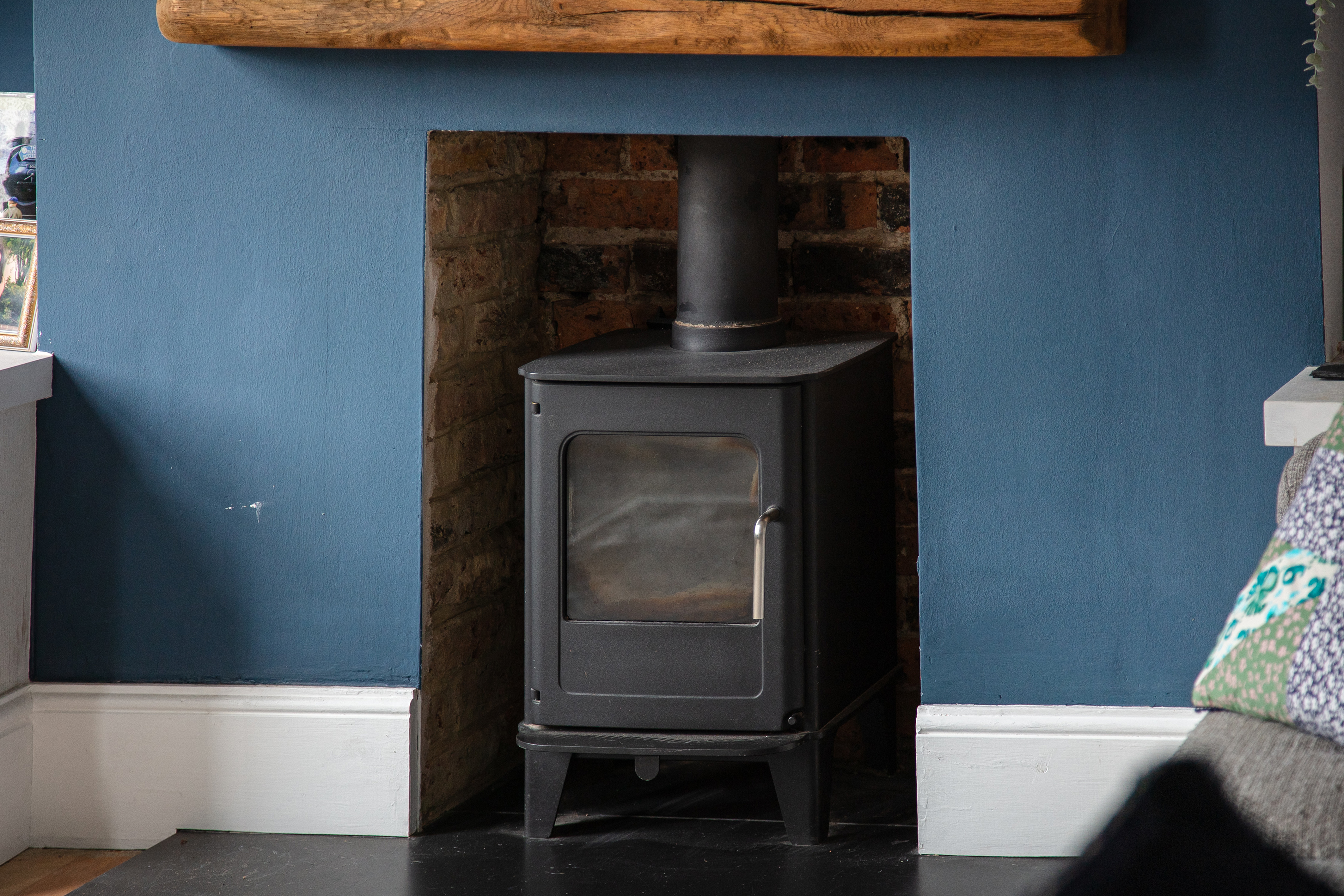 Head up the internal staircase and you're into the heart of the flat. The reception room sits at the front with two sash windows that get good natural light throughout the day. It's a proper multi-use space – room for a sofa, dining table, and all the usual living room furniture without feeling cramped. The fireplace houses a wood burner, with alcove shelving on either side that's genuinely useful rather than just decorative.