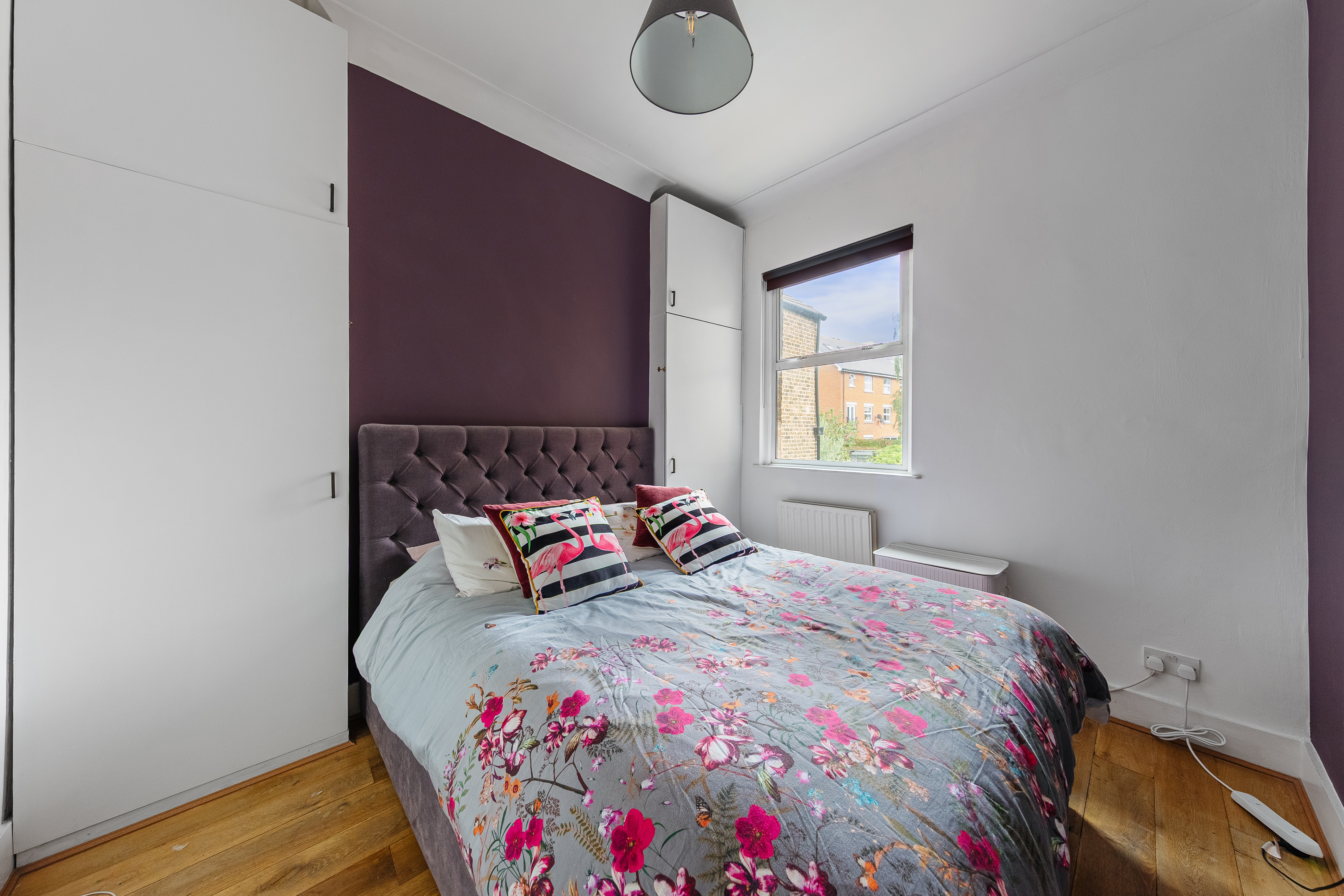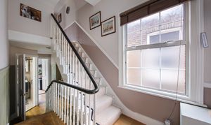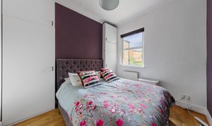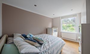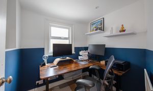 The top floor has two more bedrooms. The larger one overlooks the rear garden and has fitted wardrobes – it's quiet up here and feels properly separated from the rest of the flat. The third bedroom is smaller but well-proportioned enough to work as a child's room, nursery, or home office. For many buyers, this will immediately read as WFH space: private, away from the main living areas, and with its own character.
