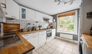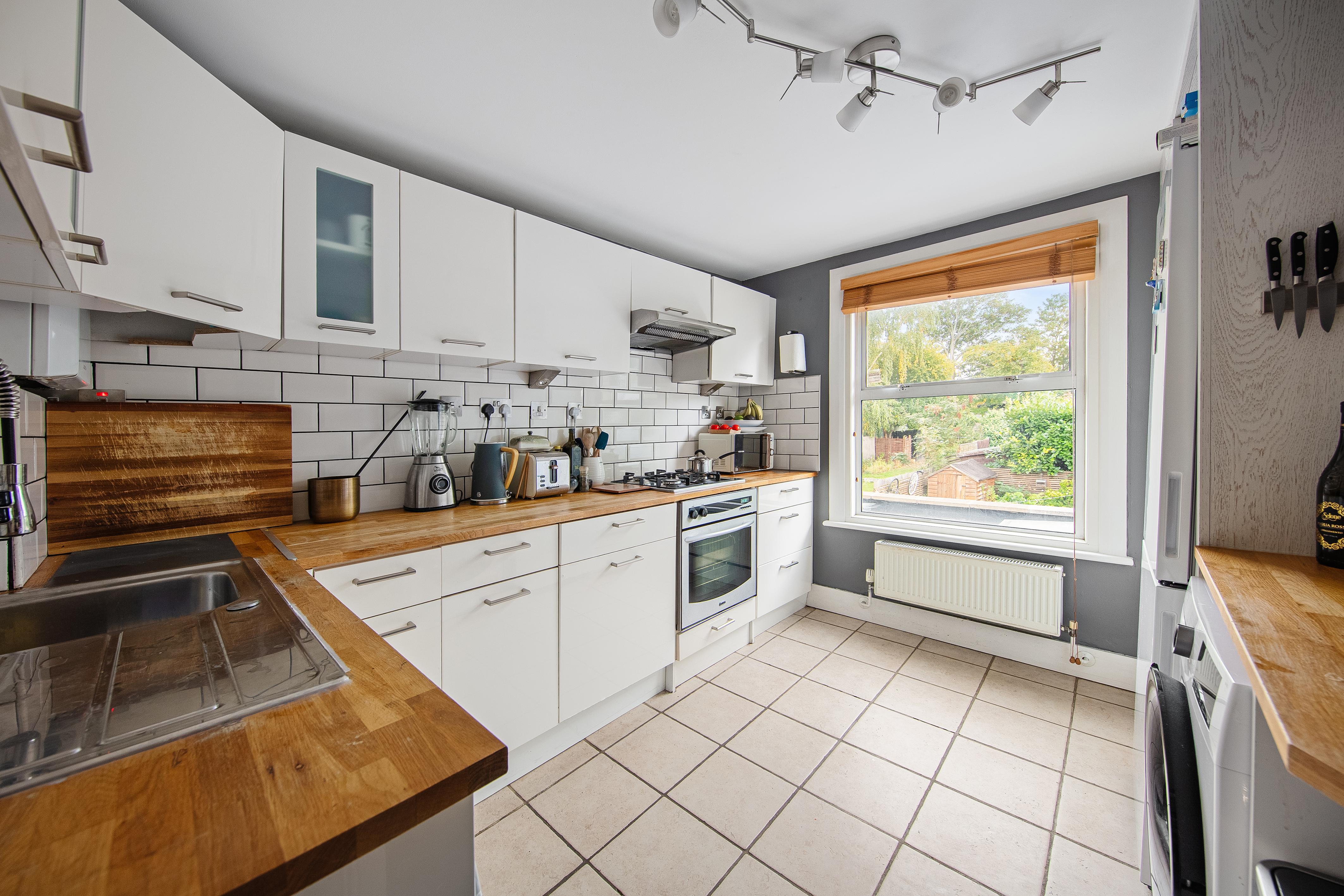 The kitchen's at the back: white cabinets, timber worktops, metro tile splashback, and decent counter space for cooking, with the all-important gas hob! The window overlooks the garden and neighbouring greenery. It's a functional space that's also pleasant to spend time in.