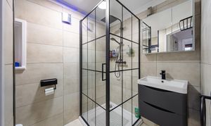 There's also a second double bedroom on this floor with a large window and fitted wardrobes, plus the bathroom – recently done with a walk-in shower enclosure featuring black-framed glass screens that give it a contemporary, Crittall-style look.