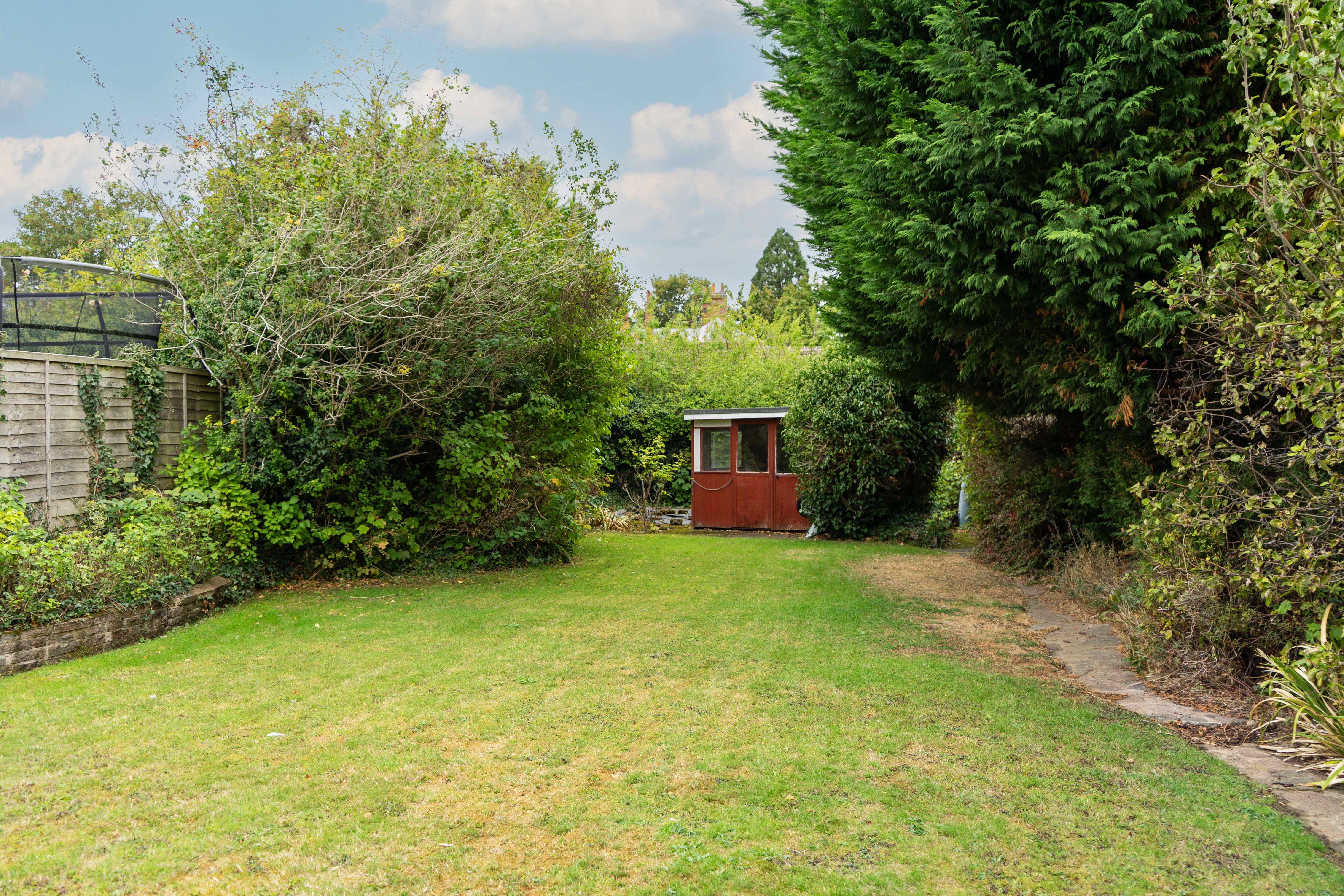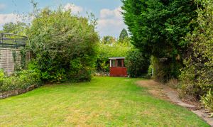 With paved patio seating area, lawn, flowerbeds and shrubs, walled and fenced perimeter, shed.