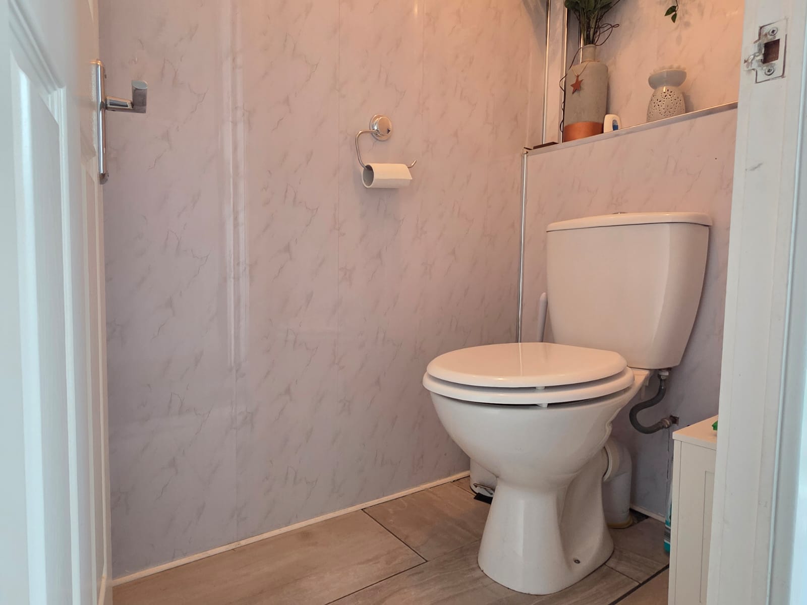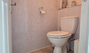 Simply includes a low level flush WC, tiled flooring, aqua boarding and obscure UPVC double glazed window.
