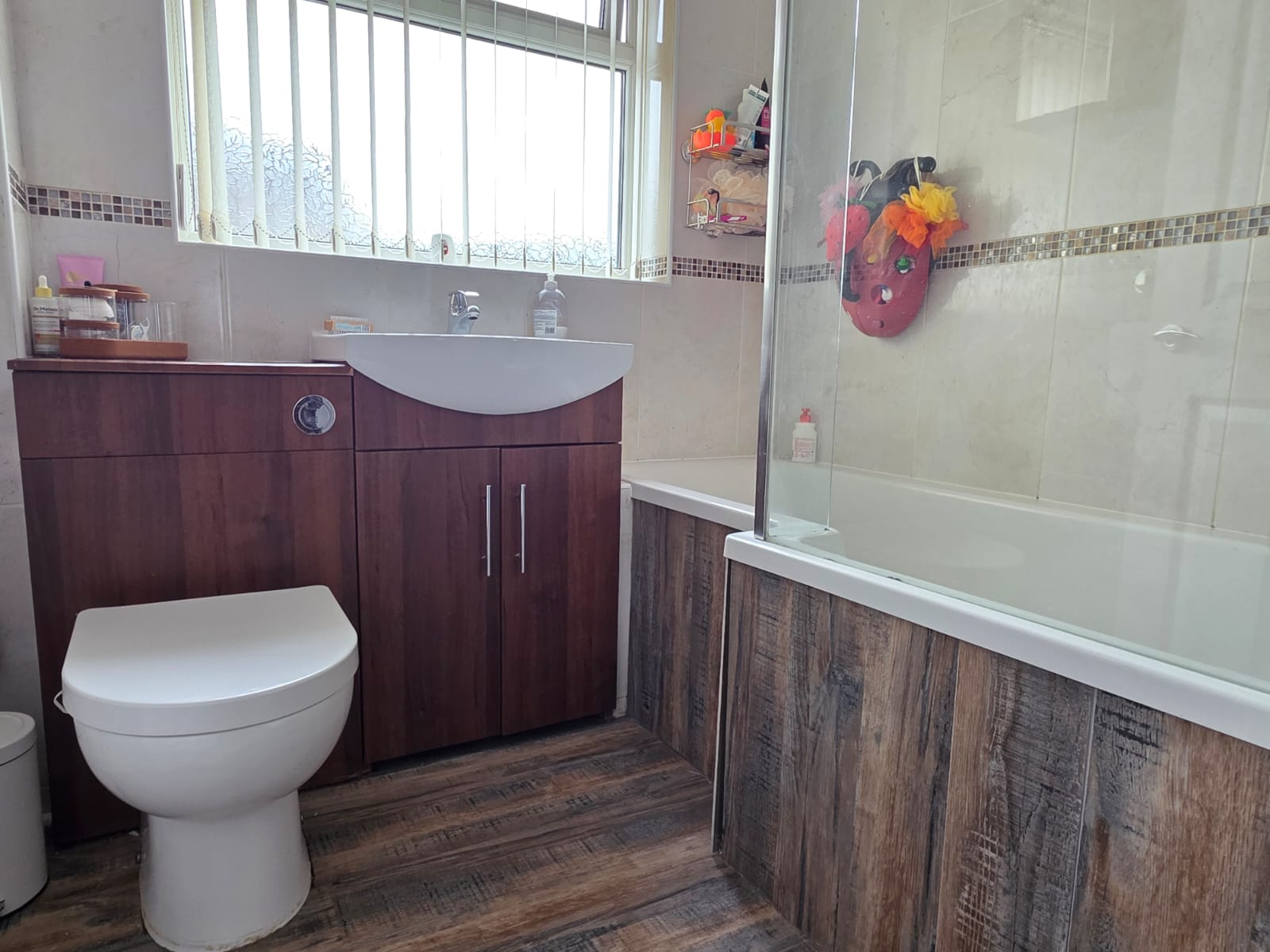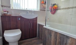 This benefits from a vanity unit with integrated WC and wash basin with mixer tap, panel bath with shower over, laminate flooring, tiled walls, chrome heated towel rail and obscure UPVC double glazed window.