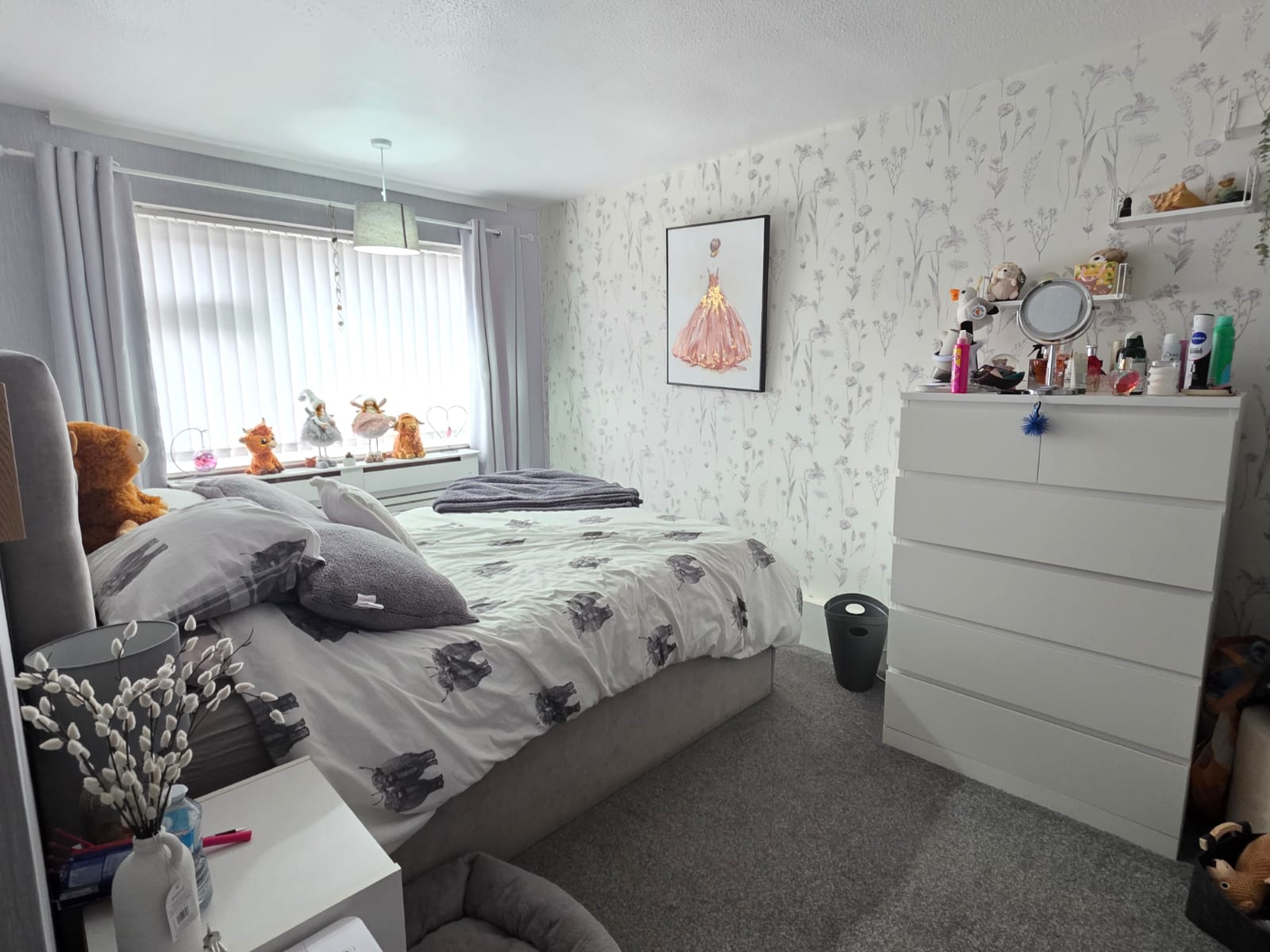 The master bedroom includes a number of integrated wardrobes, carpet flooring, radiator and UPVC double glazed window.