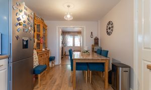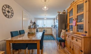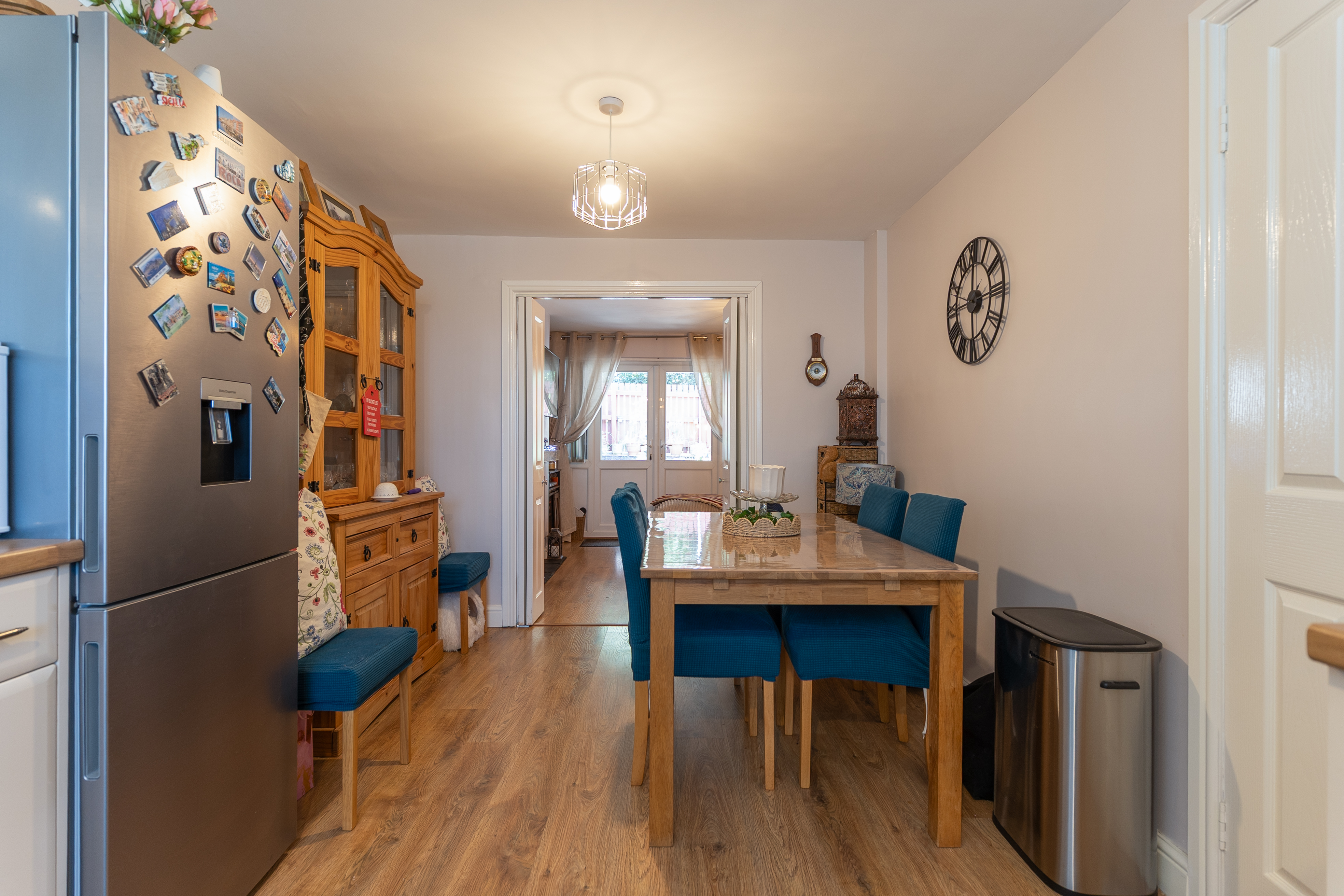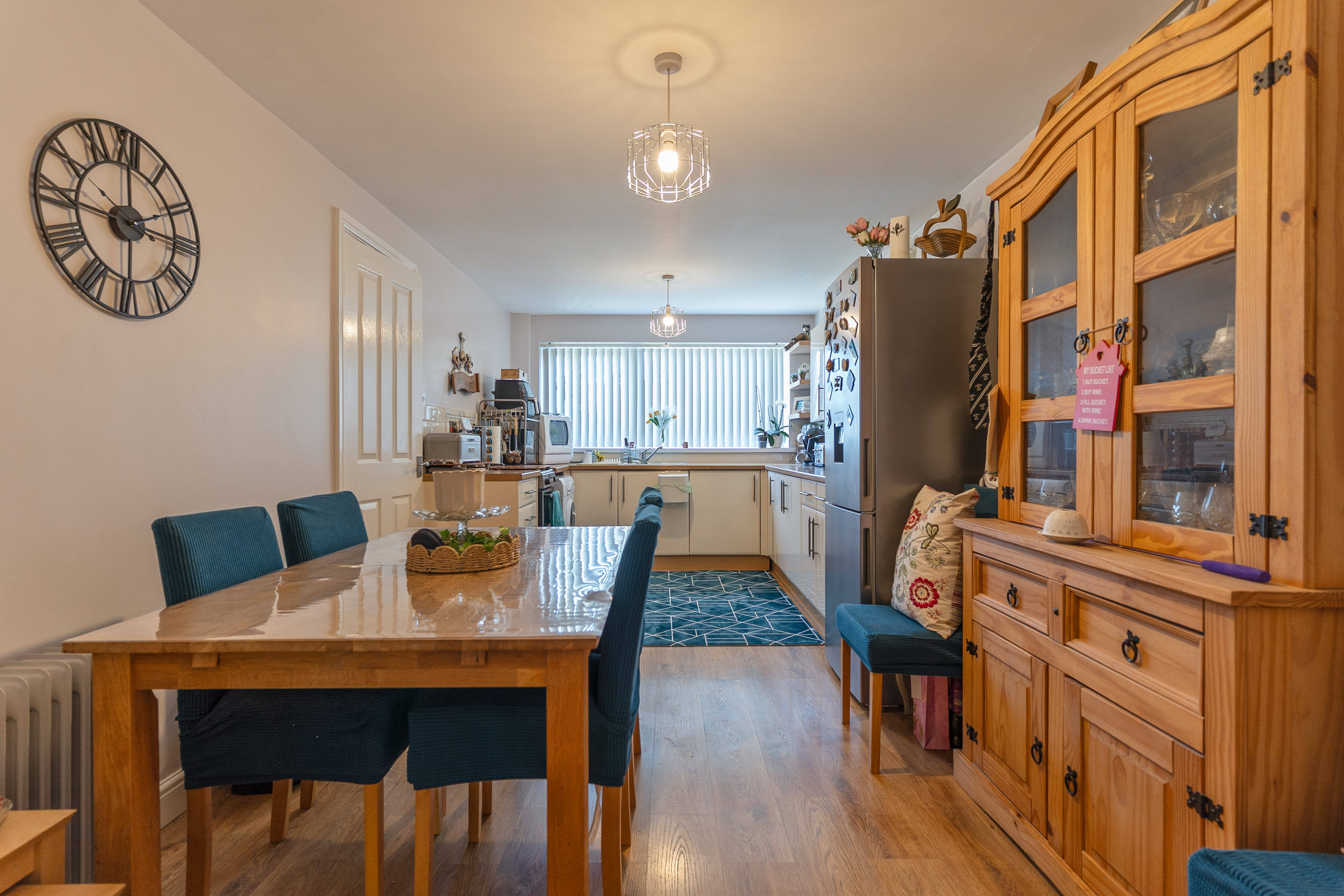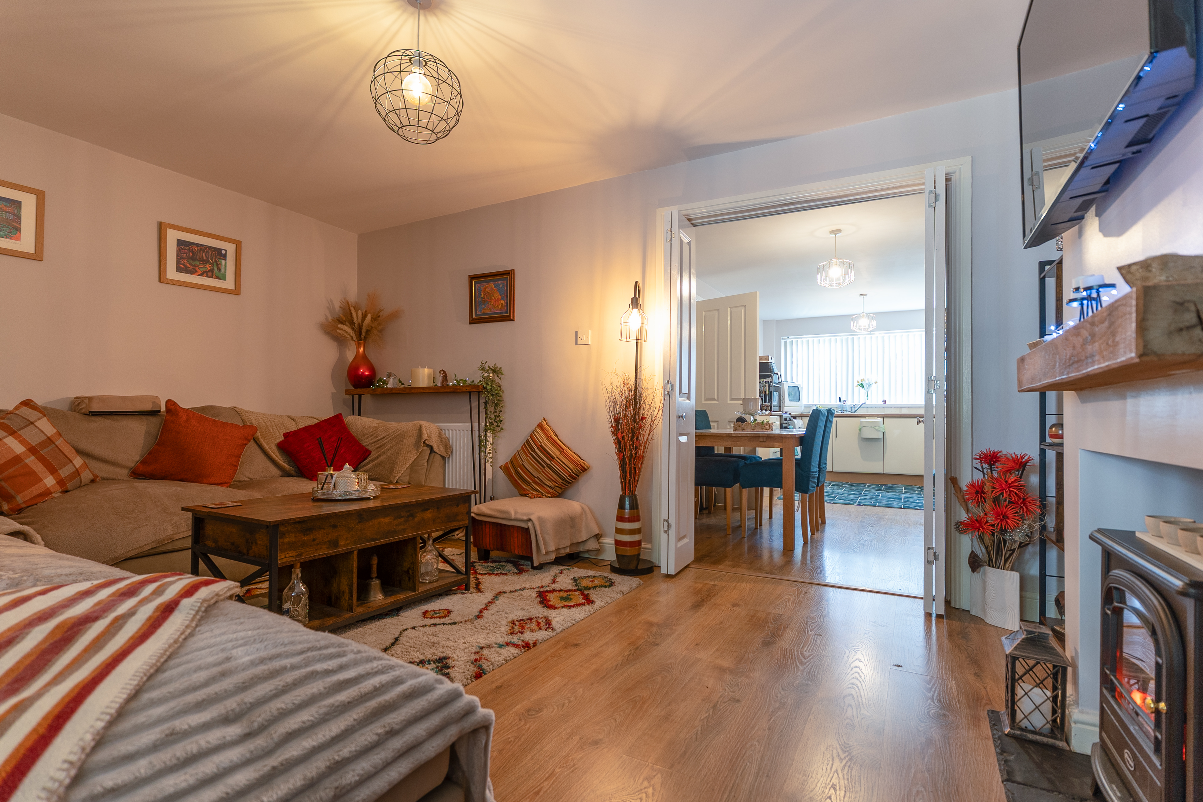 You enter the property through an initial porch, which leads into the main hallway. From here there is a cloakroom to the right, stairs ahead to the first floor and access into the kitchen and dining area. This space features an open plan layout, with a good-sized fitted kitchen and ample room for dining, creating a practical and sociable hub of the home. To the rear is the spacious lounge, centred around a feature fireplace area and benefiting from patio doors leading out to the rear garden, allowing plenty of natural light to flow through.