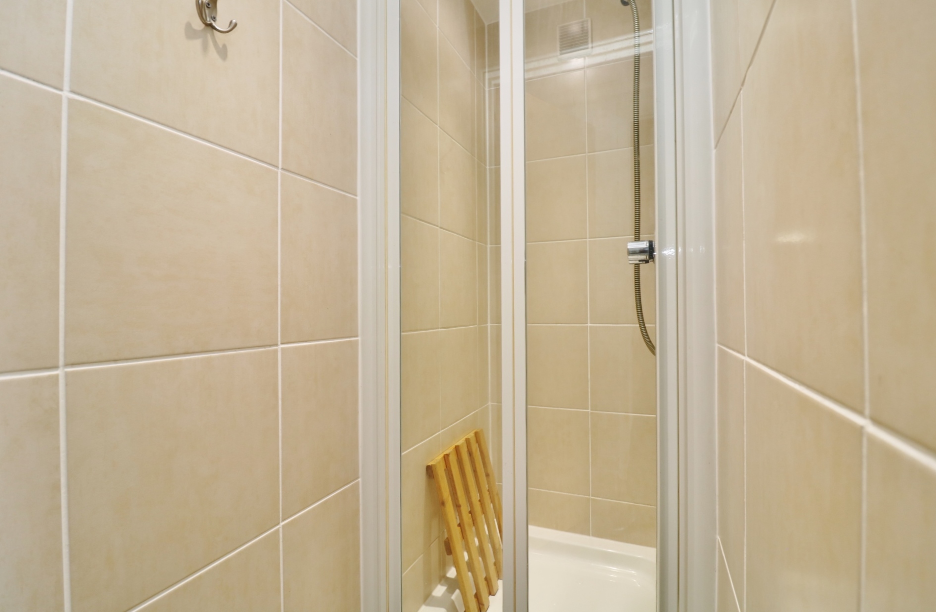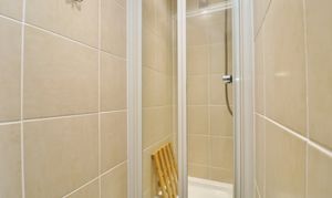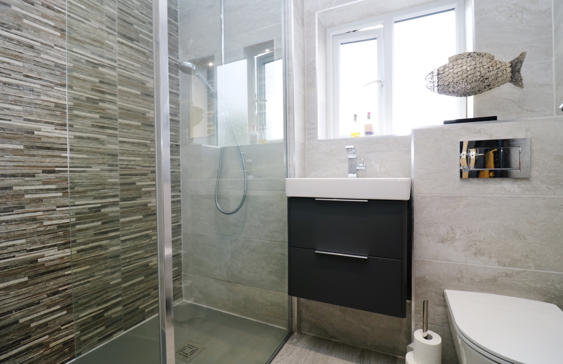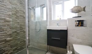 The stylish shower room comprises a vanity wash hand basin, walk-in shower cubicle, WC and a window to the rear.