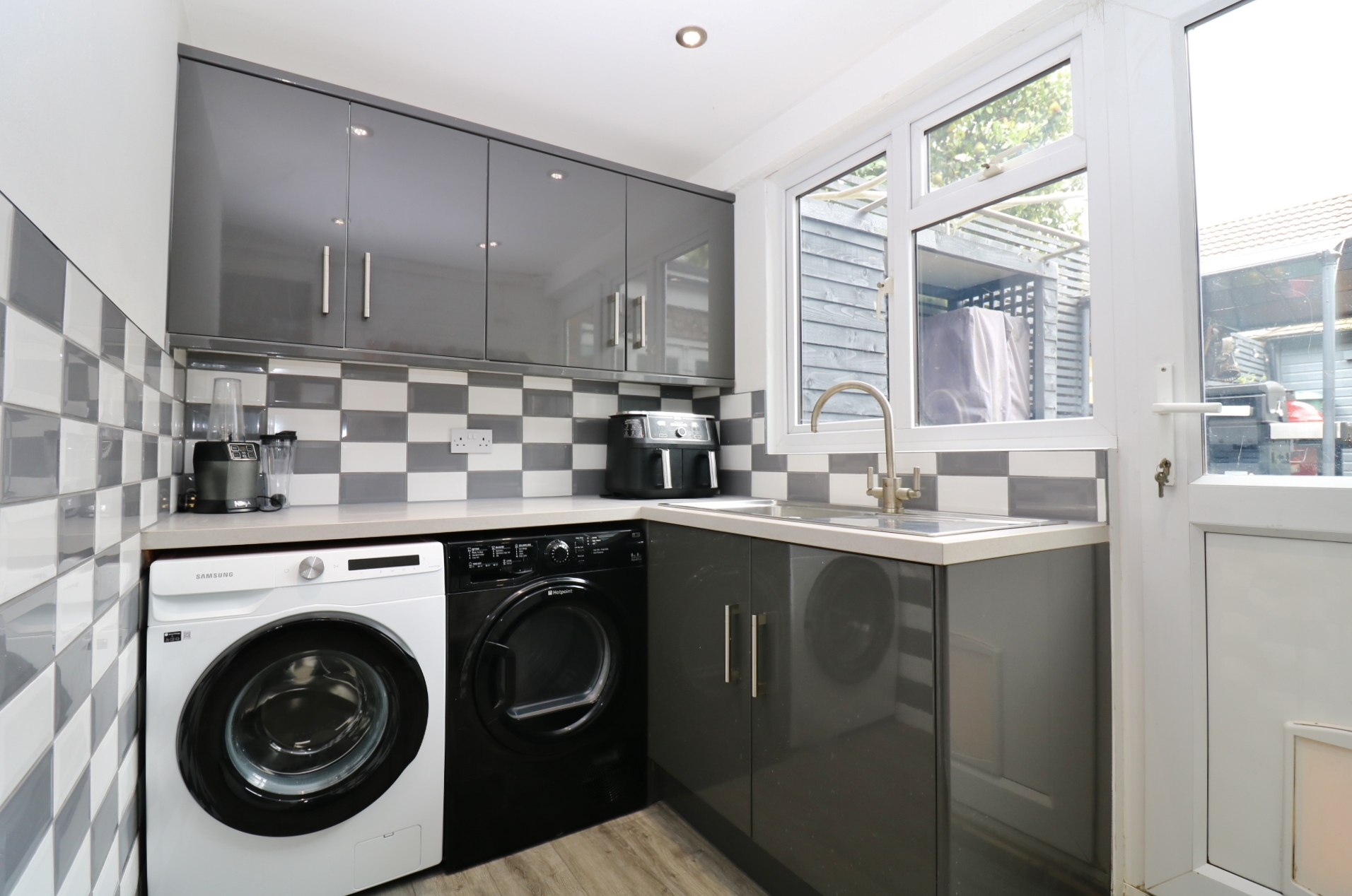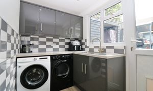 The adjoining utility offers further units, space for a washing machine and tumble dryer, as well as a window and door to the rear and access to the garage and modern shower room.