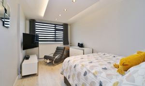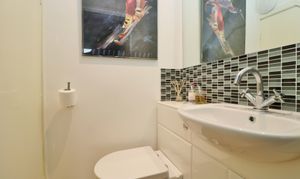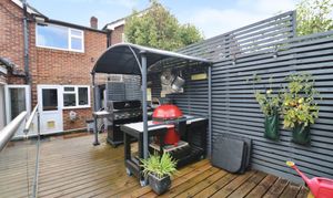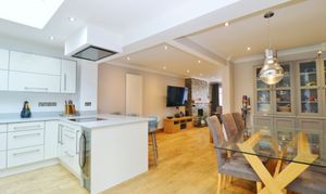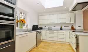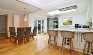 The kitchen has been fitted with a modern range of wall and base units with integrated Neff appliances including an oven, microwave oven and an induction hob with extractor over. There is also a sink with a Quooker boiling hot water tap, space for a fridge/freezer, dishwasher and wine cooler, as well as a fitted breakfast bar, a window to the rear, large roof lantern and bi-fold doors opening out to the rear garden.