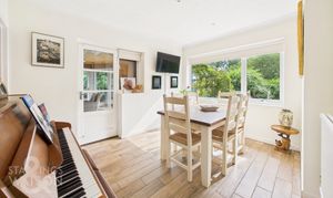 Engineered wood flooring flows from the kitchen into the impressive 19’ DUAL-ASPECT SITTING ROOM, which is illuminated by large uPVC windows. A central fireplace with a wooden mantel creates a cosy focal point, while the generous proportions allow for varied furniture layouts—reflecting the unusually large room sizes found throughout the bungalow. From here, the separate DINING ROOM provides an elegant setting for formal dining, with garden views and continued engineered wood flooring.