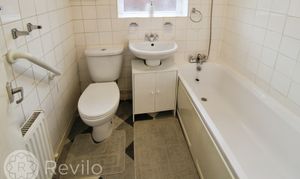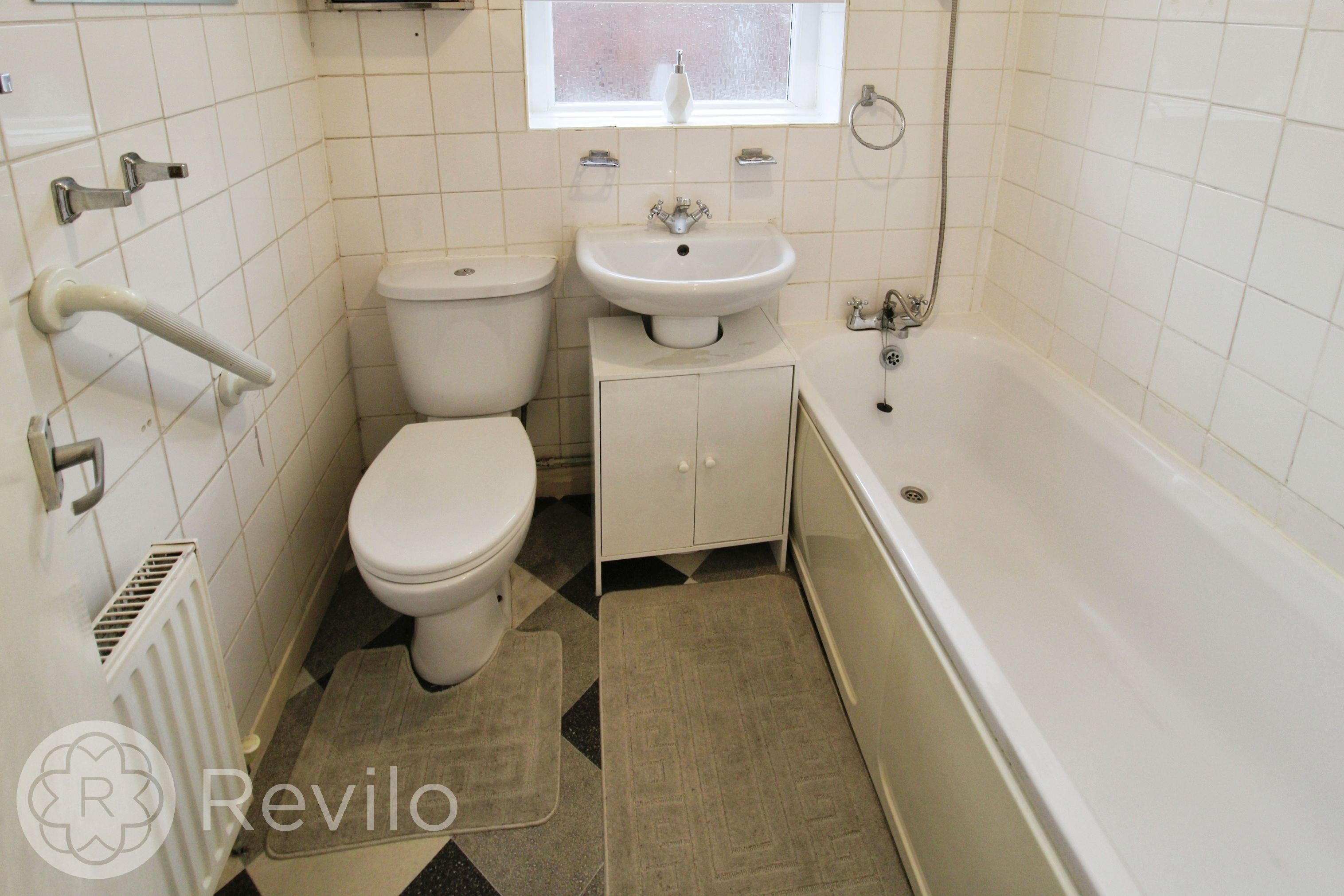 Rear facing frosted window, WC, pedestal sink, panel bath, shower attachment and tiled walls.
