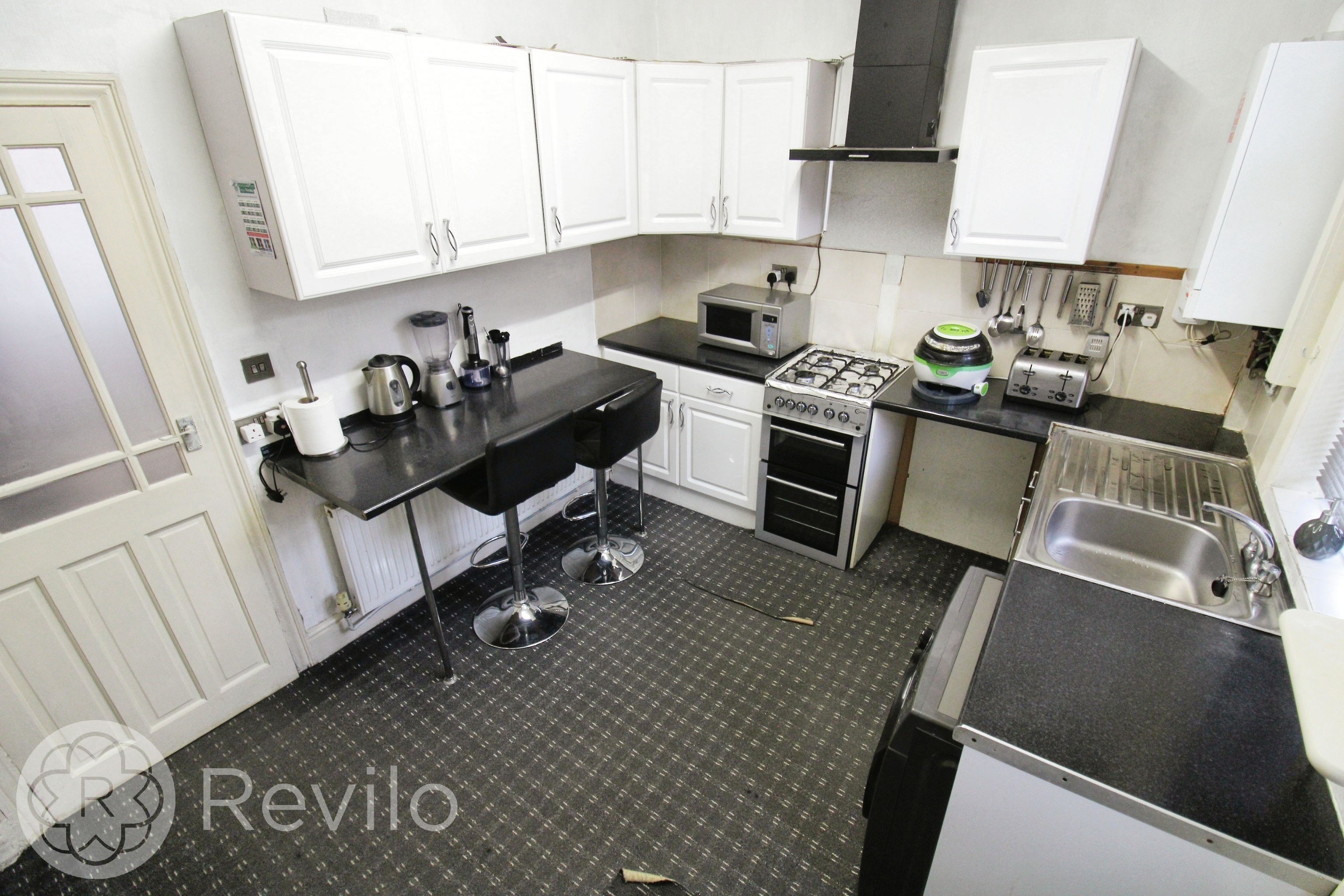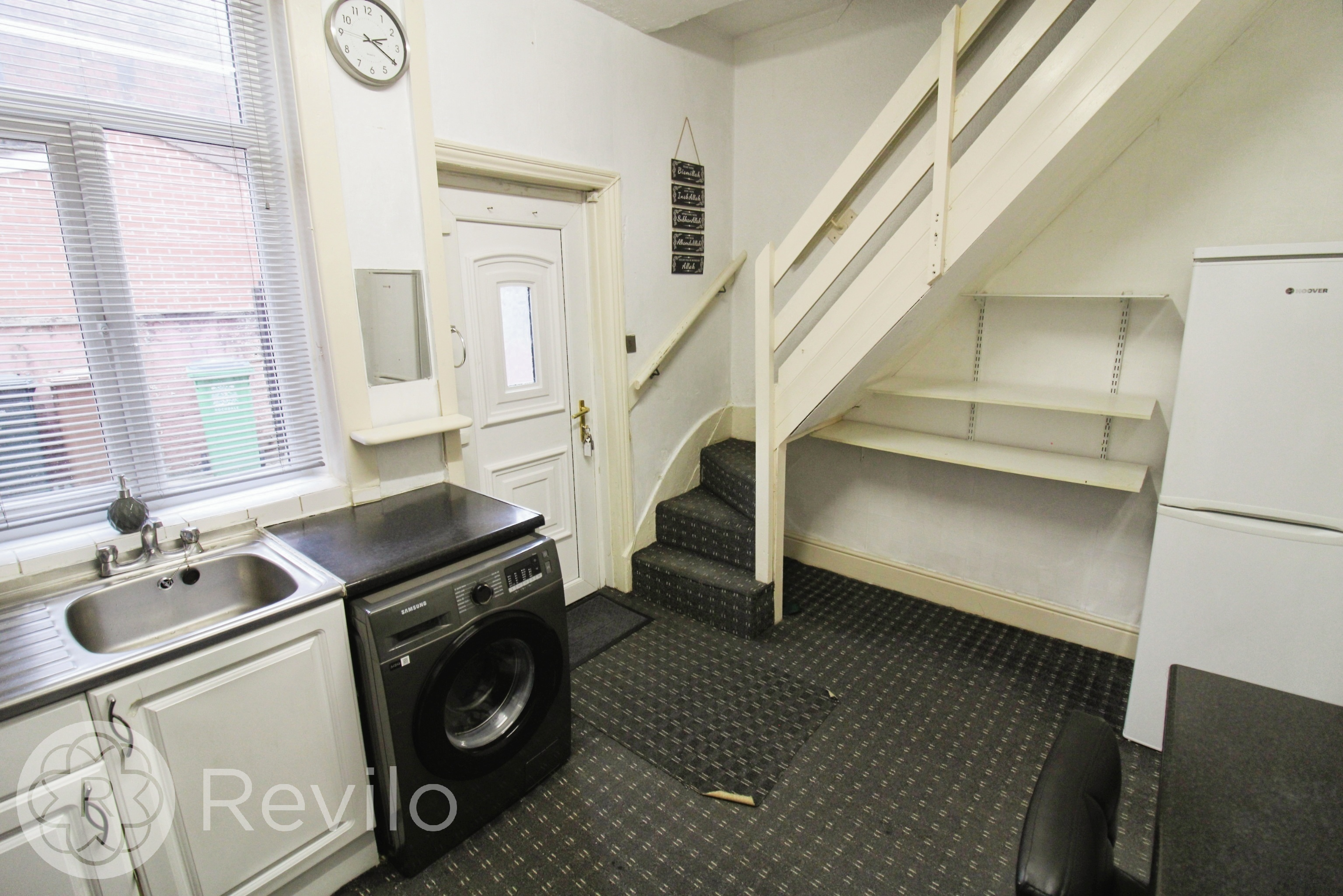 Rear facing window and door, access to the private rear yard, fitted kitchen, wall mounted boiler, gas cooker and extractor, sink & drainer and plumbed for a washing machine, staircase leading to the first floor.