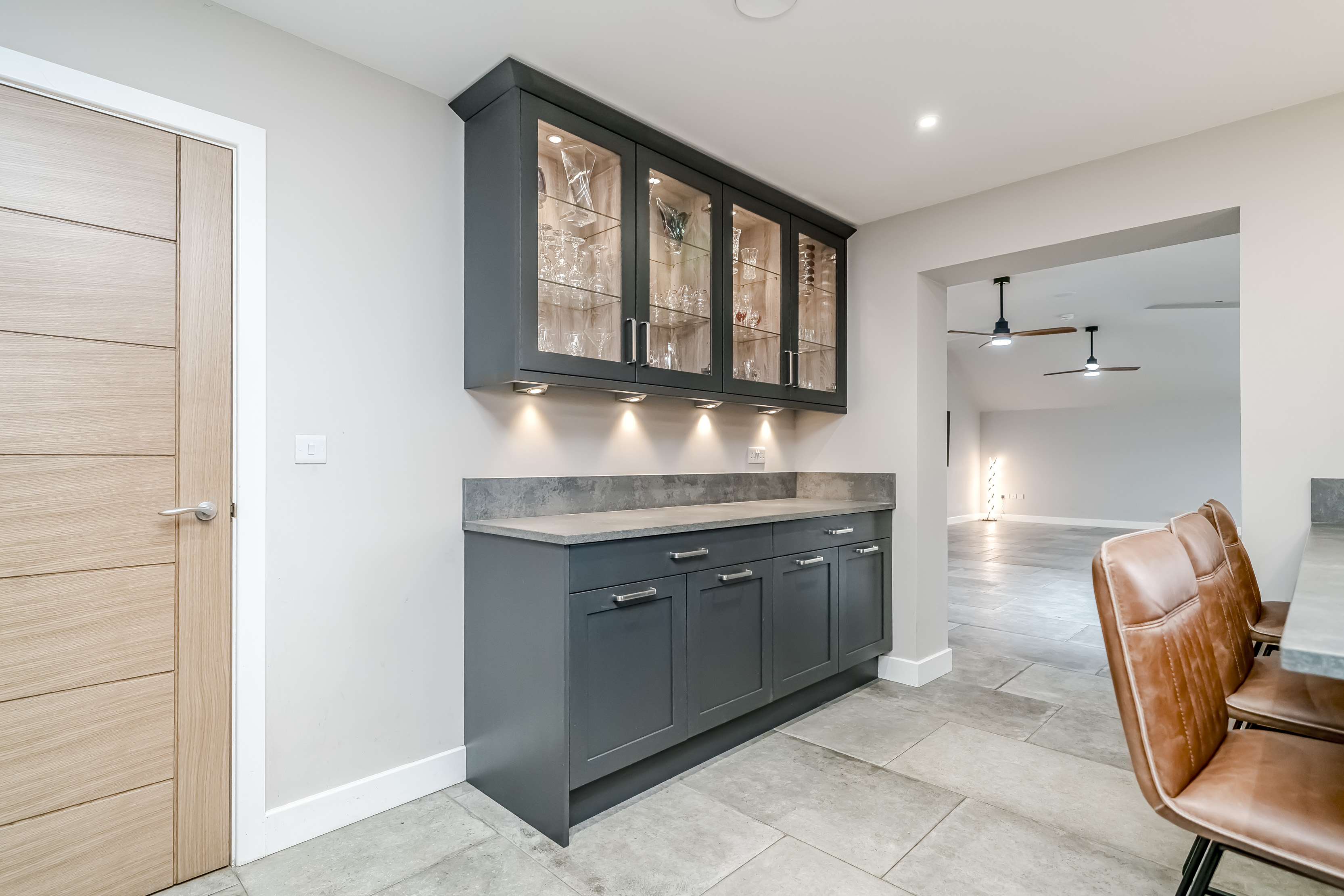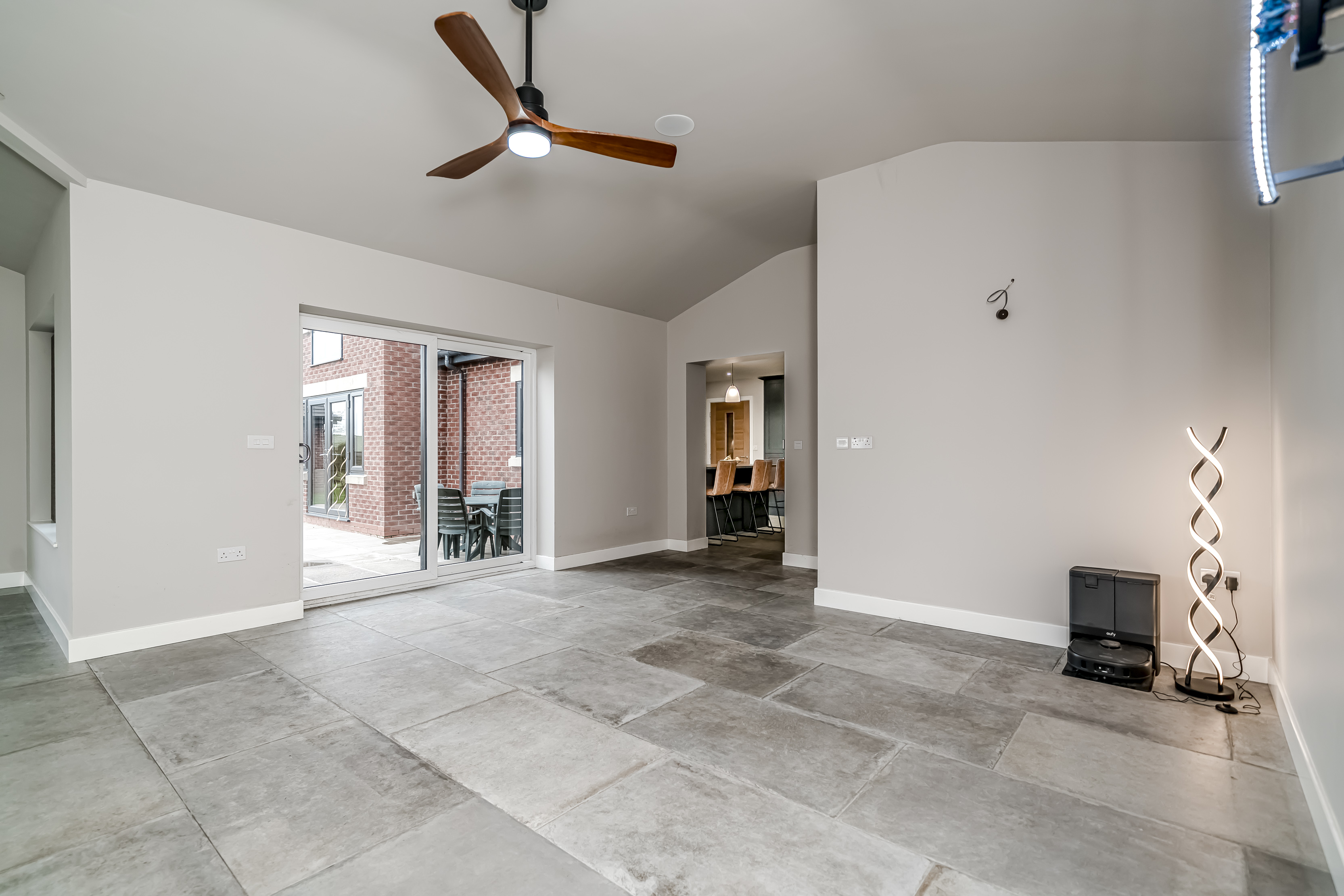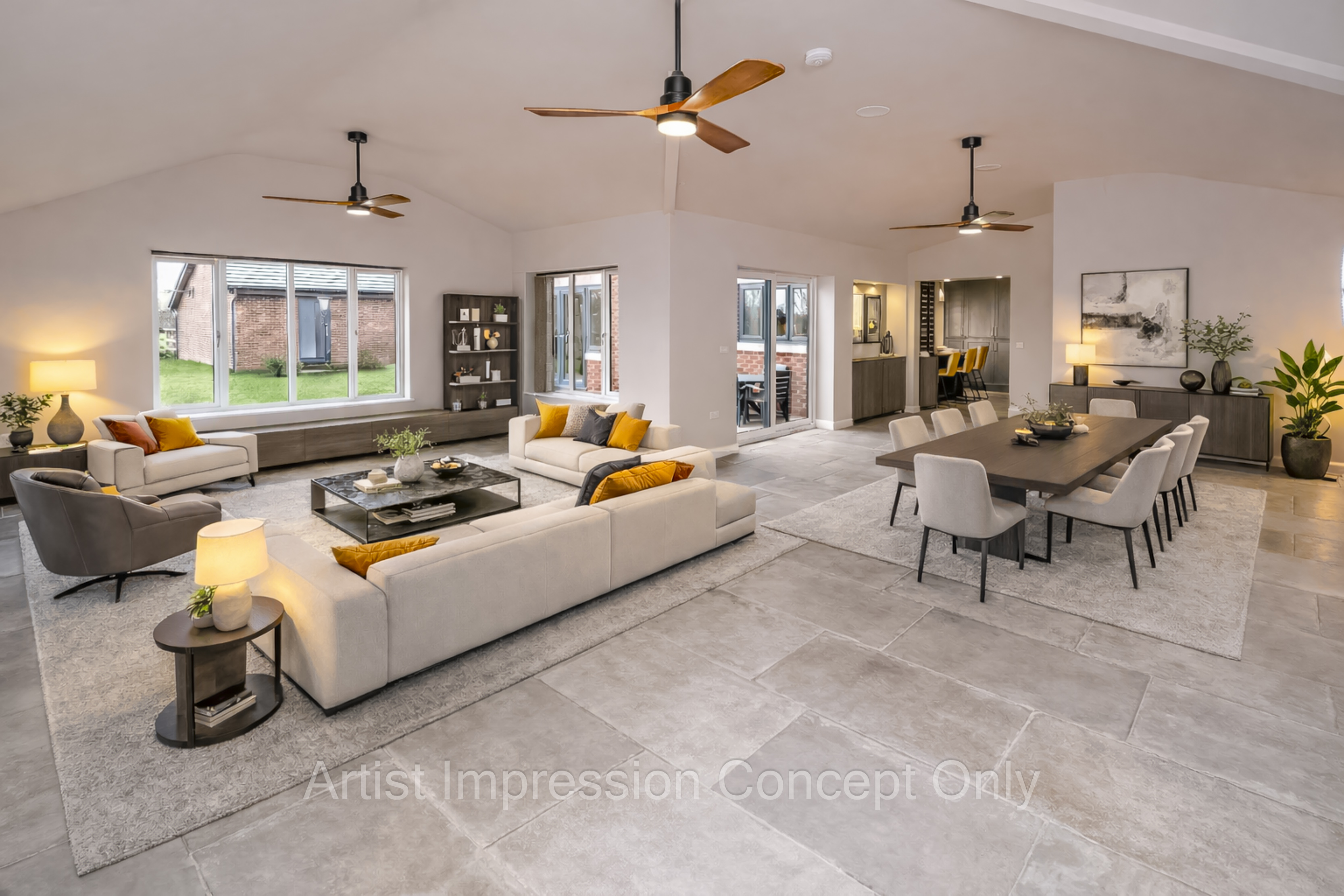 Upon arrival, one is immediately captivated by the structure’s symmetry and scale, accentuated by the sunset-lit elevations that create an inviting sense of arrival. This initial impression, while profound, is only a precursor to the thoughtful and striking design that prevails within. The heart of the home is its magnificent 31-foot open-plan living space, featuring vaulted ceilings and expansive glazing that flood the interior with natural light while offering breathtaking views of the garden, complemented by integrated Bluetooth speakers within the ceiling throughout the ground floor. This space is crafted for entertaining, relaxing, and enjoying everyday luxury—a perfect setting for the creation of lasting memories.