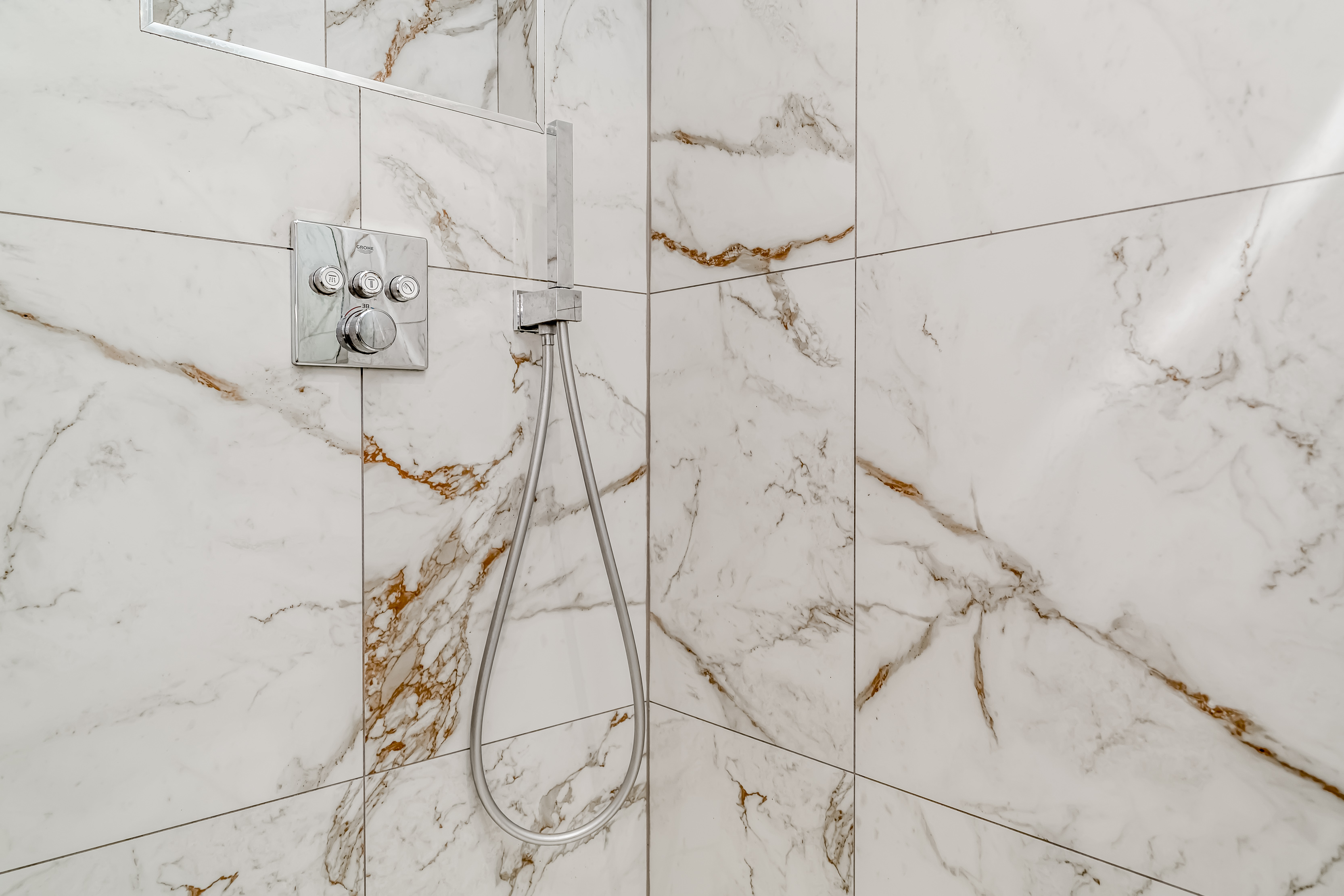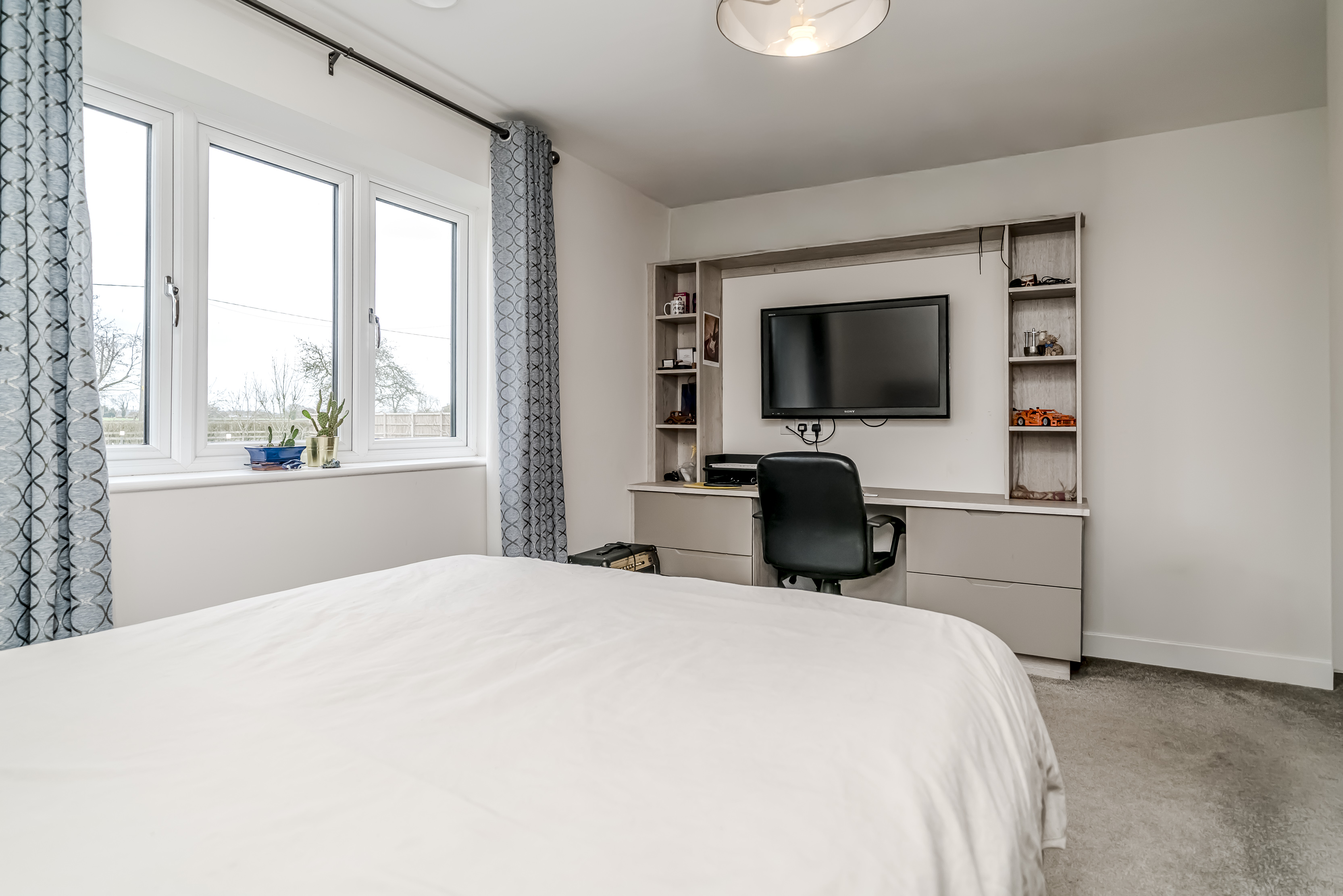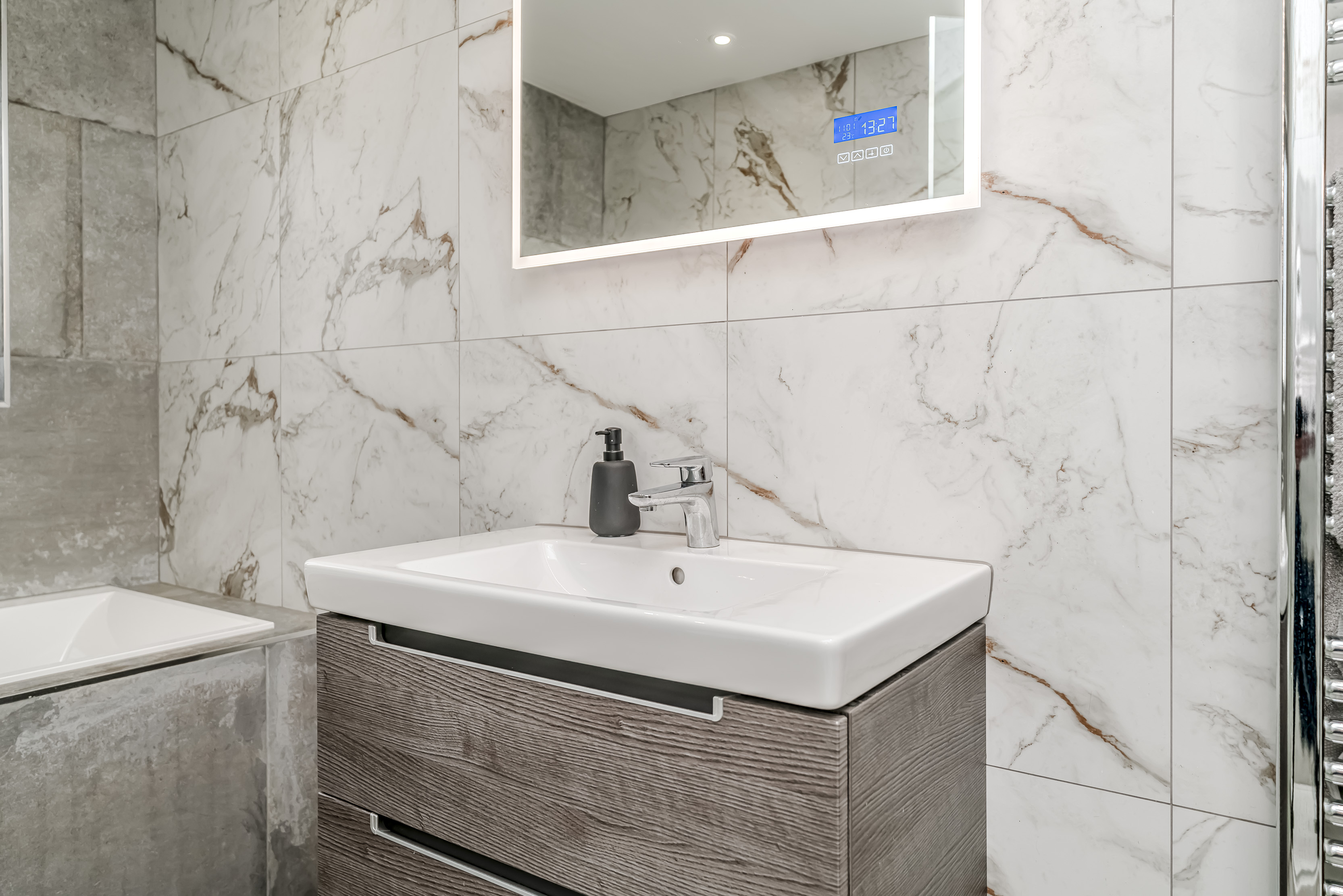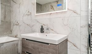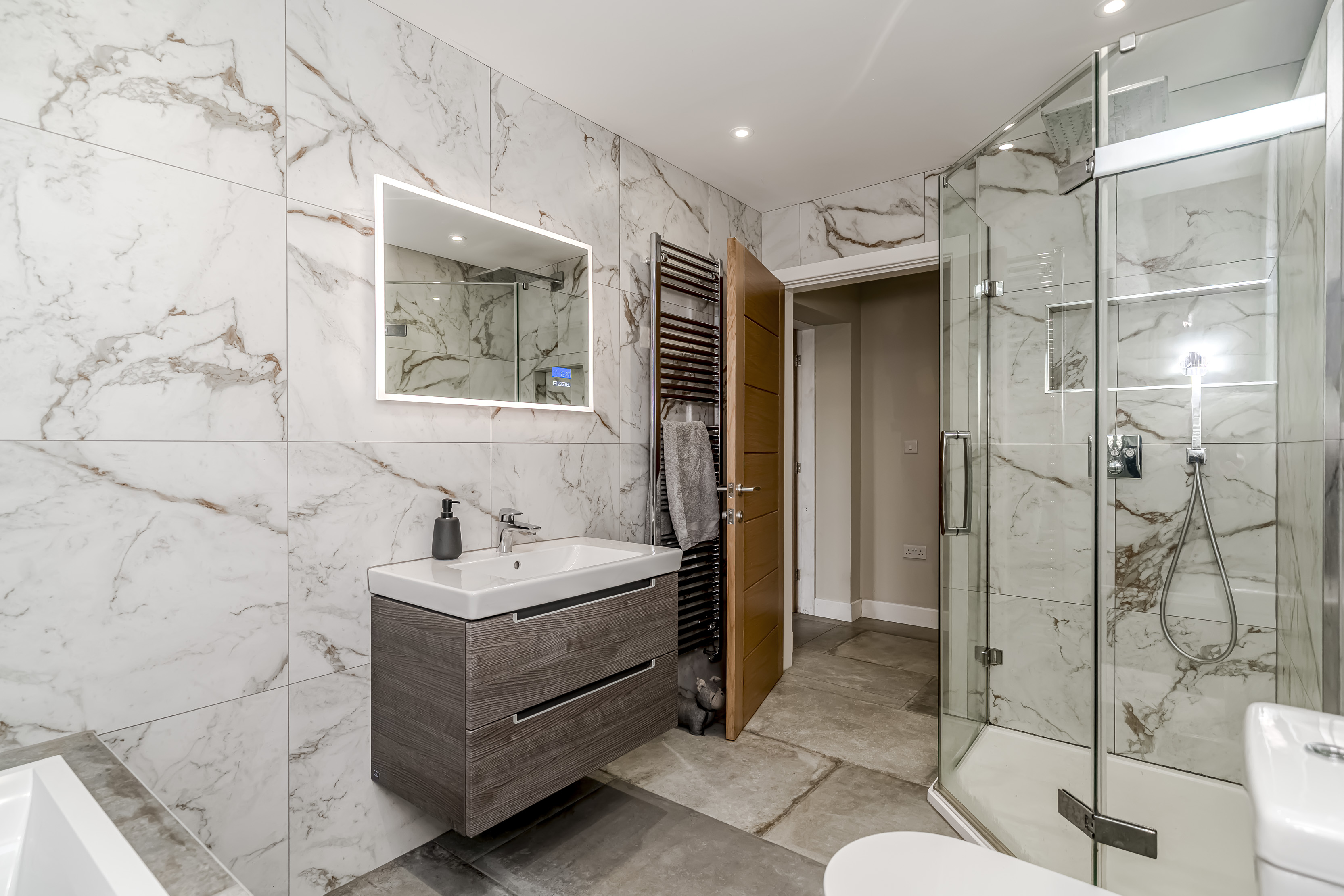 Ascending to the upper floor, Holly Lodge continues to impress with indulgent Villeroy & Boch bathrooms. These luxurious spaces offer not only functionality but a retreat-like atmosphere, featuring jacuzzi baths, Grohe showers, and heated Bluetooth speaker mirrors, which elevate the private quarters to new standards of comfort. The generously sized bedrooms offer serenity and respite, with tranquil countryside views enhancing the sense of retreat.