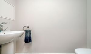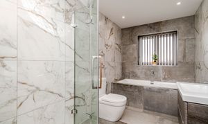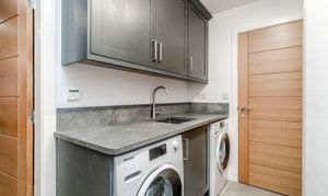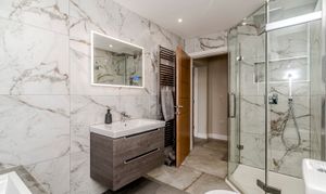 The kitchen boasts a sleek and refined design, equipped with Infiniti Stone worktops and a suite of premium Neff appliances, complemented by a Quooker tap. Functionality is seamlessly integrated with thoughtfully designed utility areas. Additionally, the ground floor houses a snug, a study, two bedrooms, a boot room, and a flexible gym or bedroom, ensuring the space adapts effortlessly to the demands of modern family life.