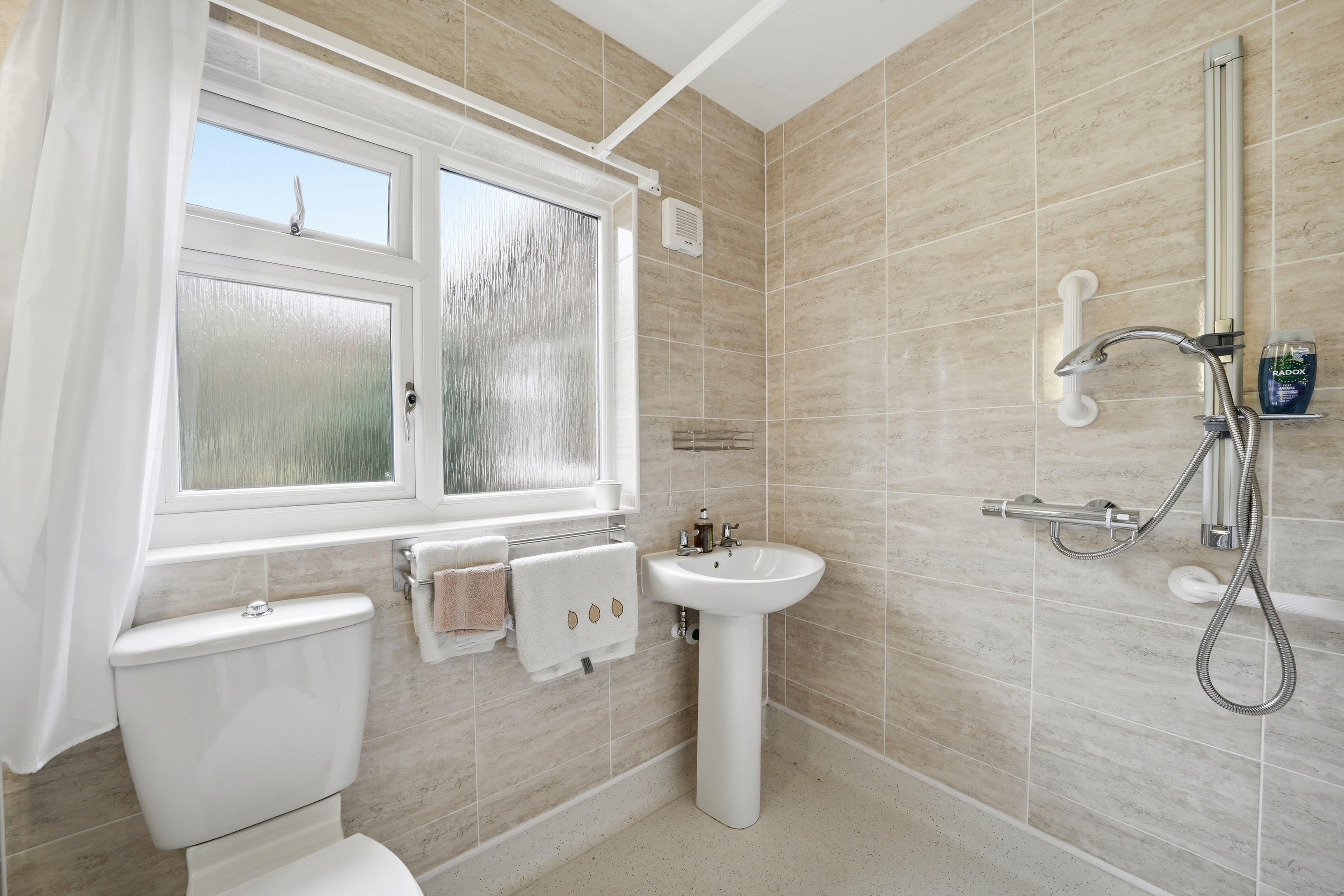 With ceiling light point, frosted uPVC double glazed window, floor to ceiling tiled walls, fitted backlit mirror, chrome ladder style heated towel rail and having a wet area with chrome shower fitting, pedestal wash basin and low flush w.c.