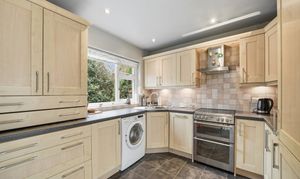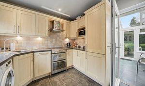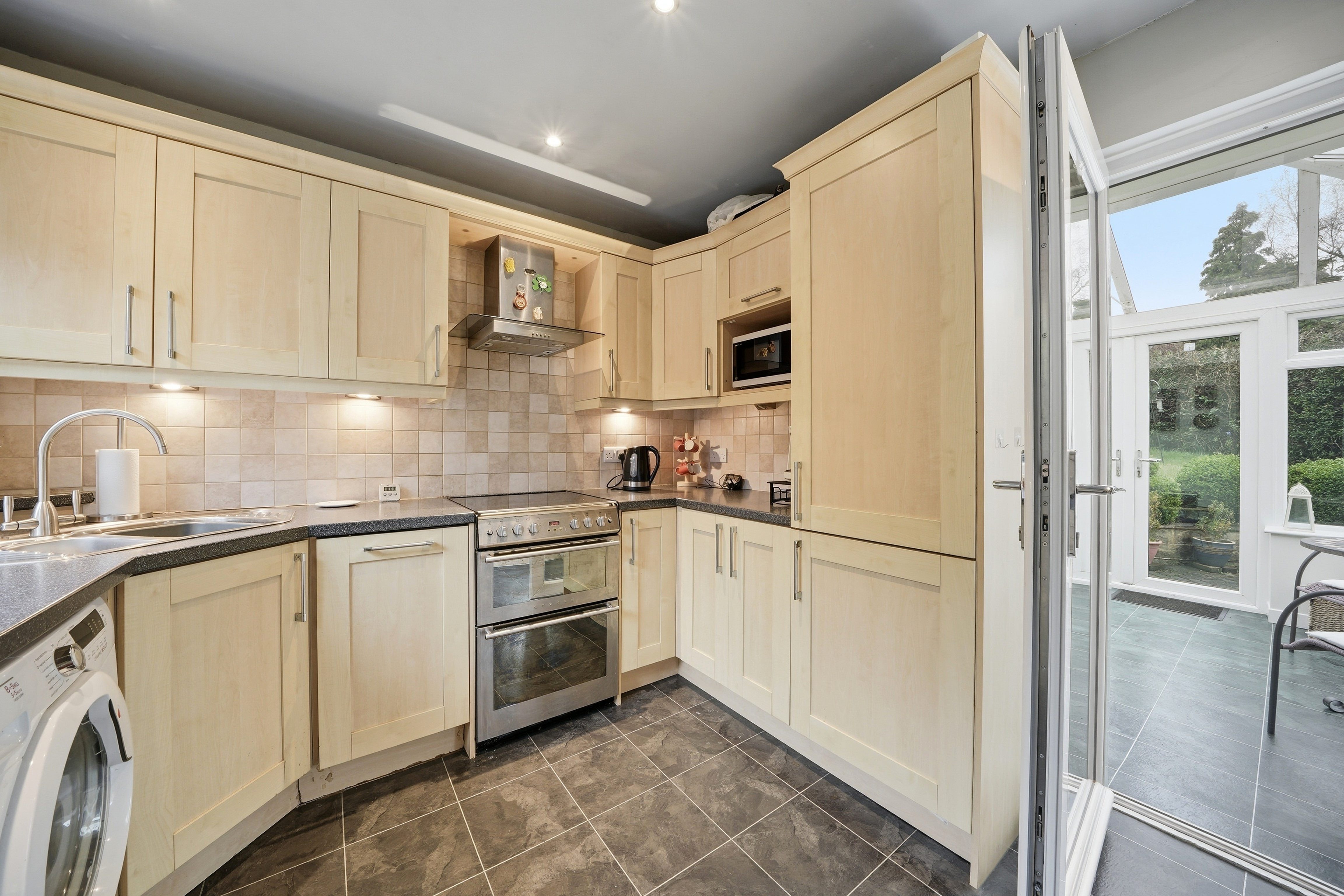 With a uPVC double glazed window, inset ceiling downlighters, central heating radiator, tile effect flooring and fitted with a range of shaker style base and wall cupboards, drawers, contrasting overlying worktops with tiled splashbacks, inset one and half bowl stainless steel sink with brushed stainless steel mixer tap, cupboard housing a Vaillant gas fired central heating boiler, free standing Stoves cooker with four ring hob and with a double oven beneath, stainless steel and glass extractor hood over, integrated fridge, integrated freezer, integrated slim line dishwasher, automatic washing machine, concealed lighting beneath the wall cupboards, central heating radiator and to one side a uPVC and double glazed door opens into the conservatory.
