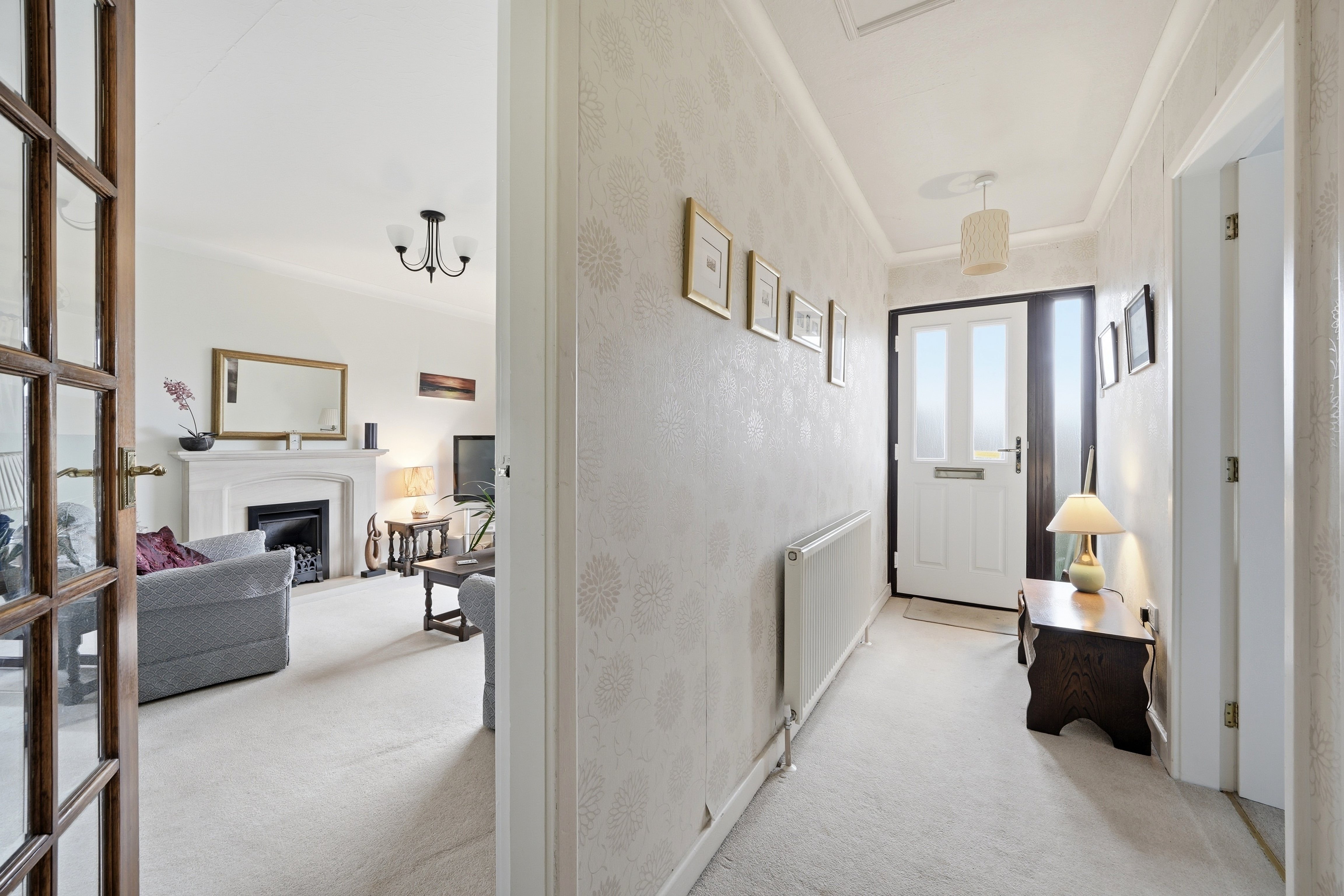 With composite panelled and frosted double glazed door with adjacent frosted uPVC double glazed window all of which provide this area with natural light. There is a ceiling light point, ceiling coving, loft access and central heating radiator. From the hallway access can be gained to the following: -