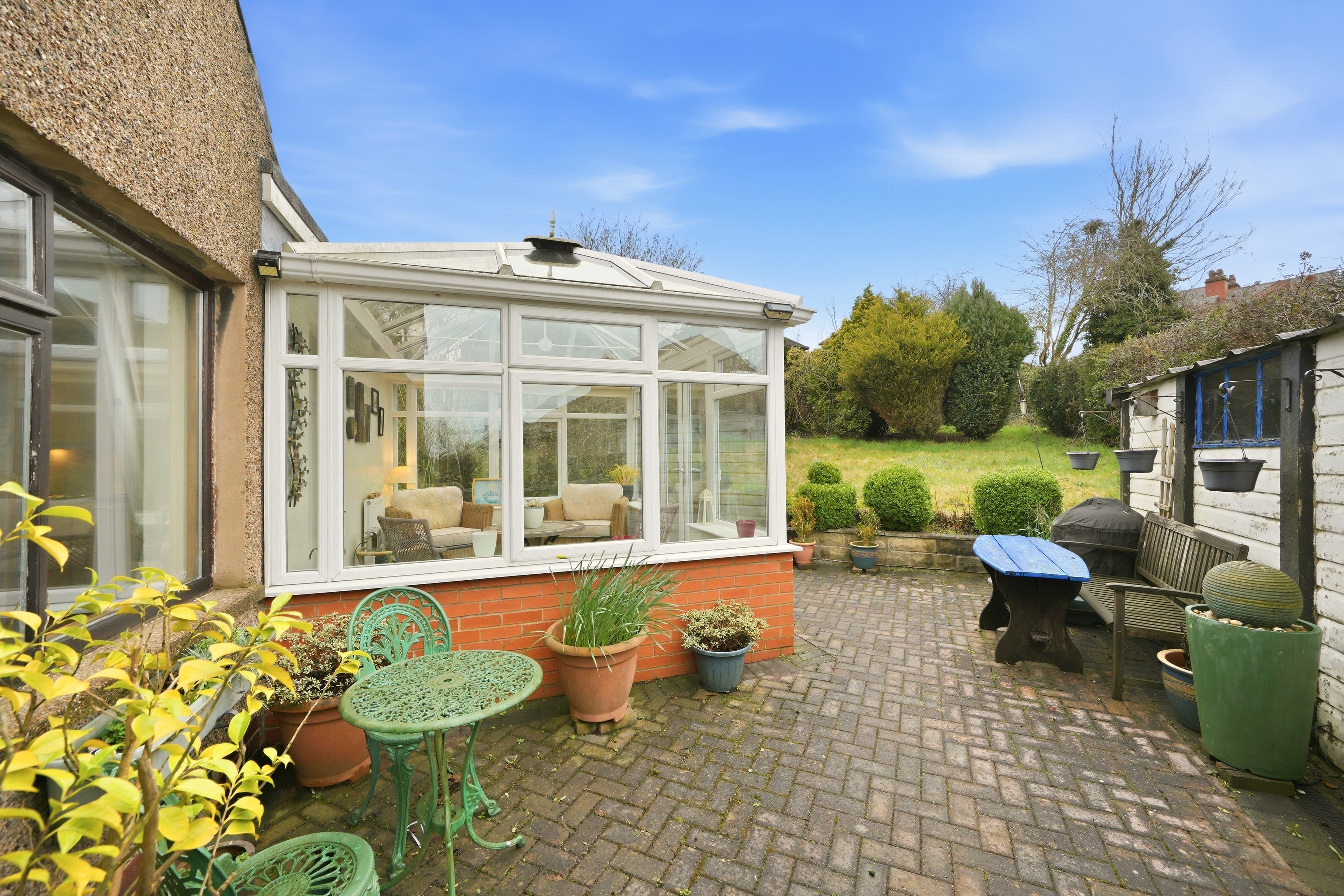 To the front of the property there is a lawned garden with planted trees and shrubs to the borders together with a pathway giving access to the main entrance. Between the bungalow and garage there is a timber hand gate opening onto a herringbone block paved patio and beyond this there is a large lawned garden which is laid out to the side and rear and is well screened offering a good degree of privacy with trees and shrubs.