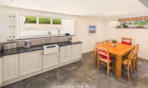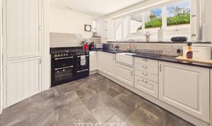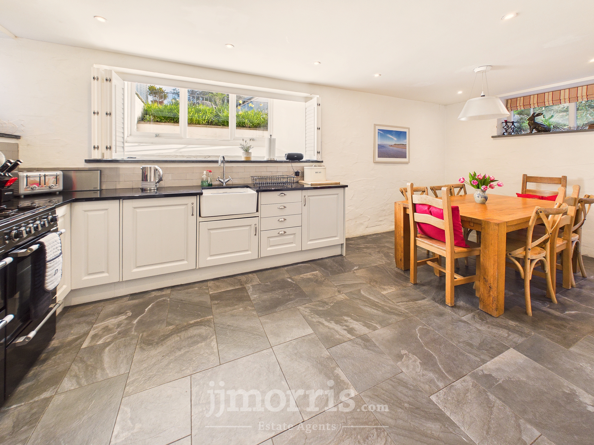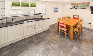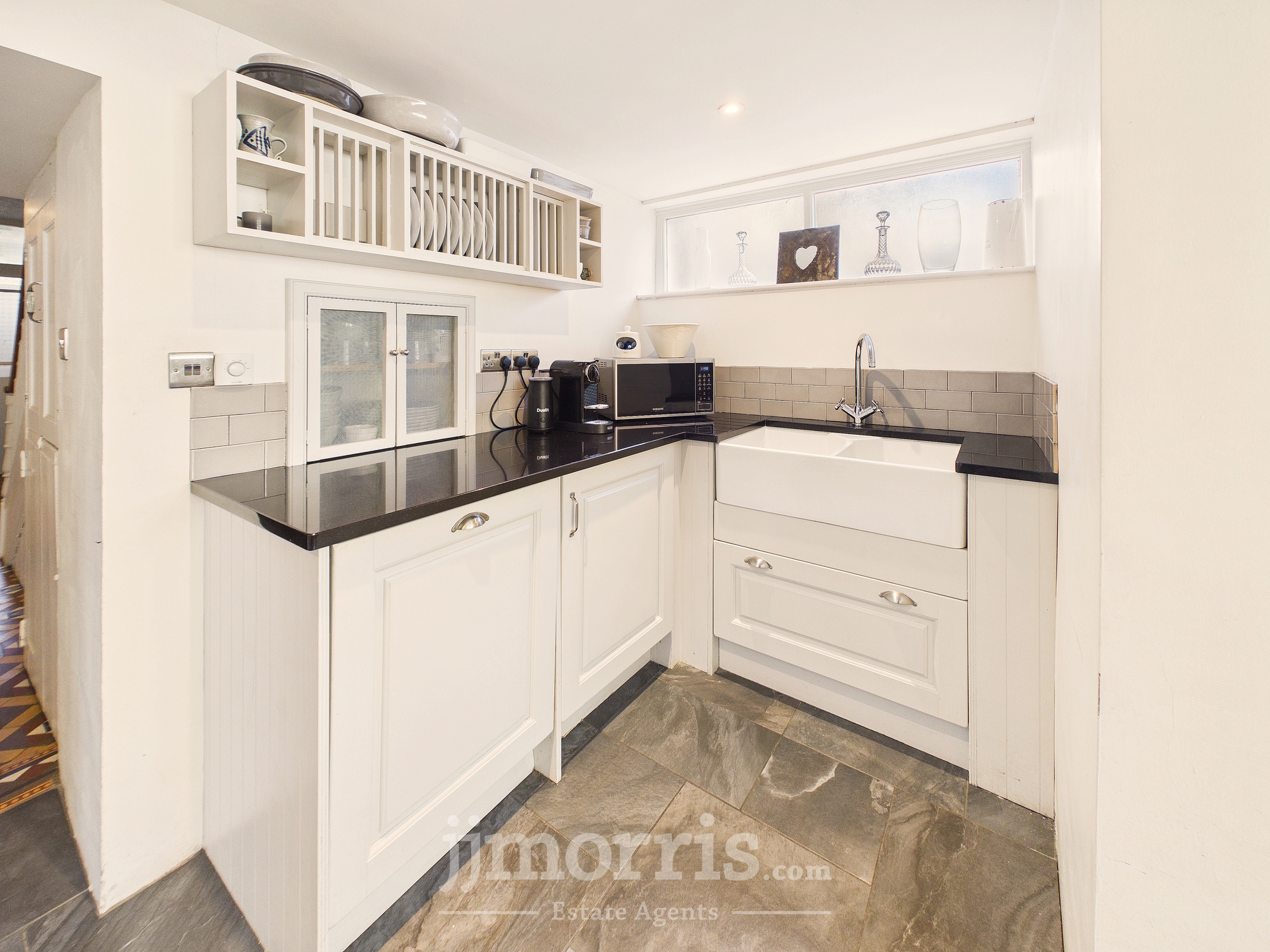 With a slate effect ceramic tile floor with underfloor heating, 2 single glazed windows, double glazed door to exterior, floor cupboards, double Belfast sink with mixer tap, Granite worktops, plate rack, 3 downlighters, built in Beko dishwasher, built in AEG washing machine, central heating thermostat control, tiled splashback, built in Meat Safe with shelf, fitted base cupboard concealing central heating manifold with slate shelf over, 6 power points and archway to:-
