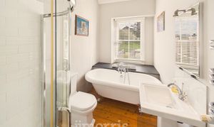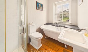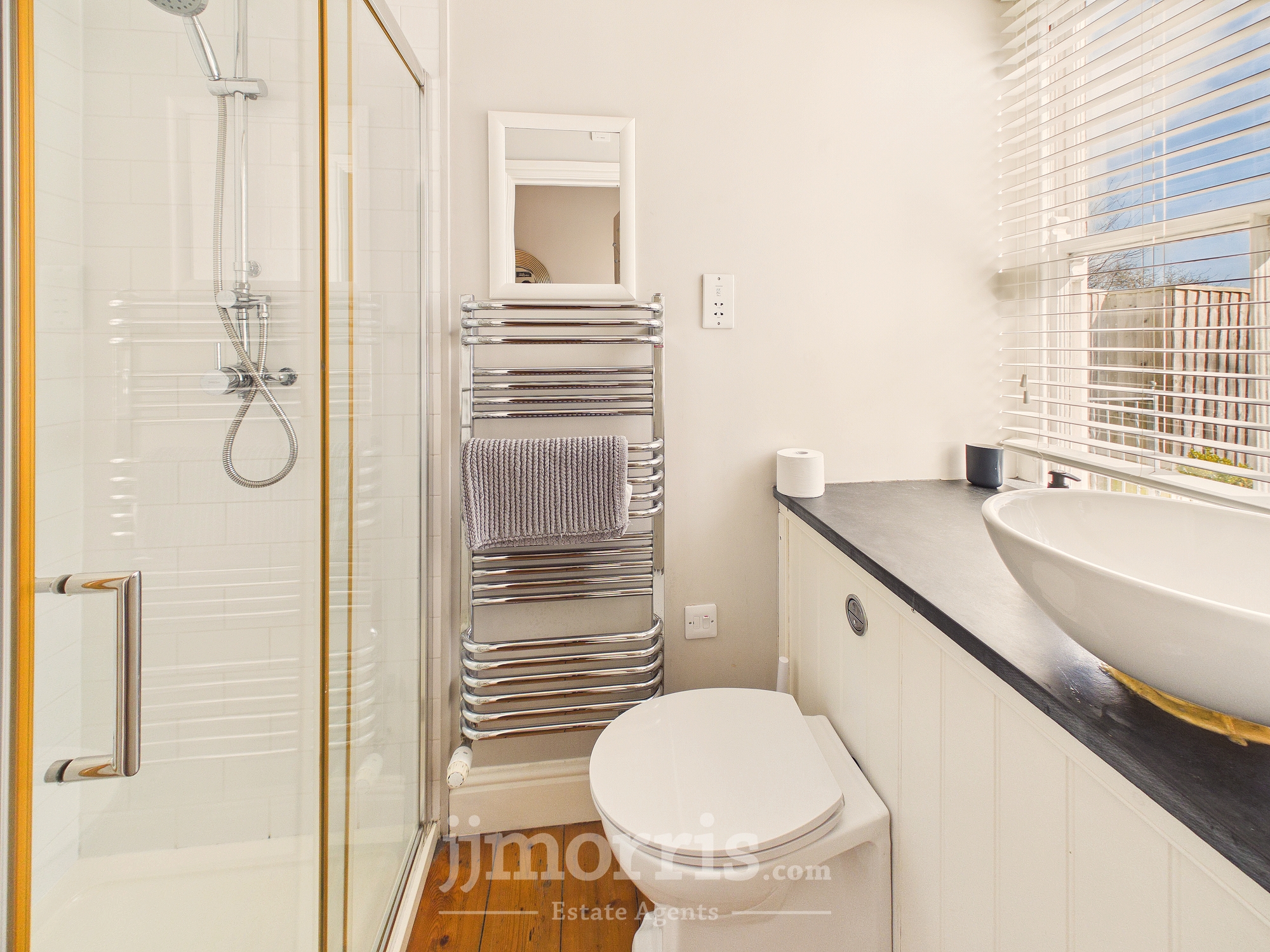 With single glazed window to rear, Pine floorboards, white suite of WC, Wash Hand Basin with mixer tap and a Glazed and Tiled Shower Cubicle with a Bristan Thermostatic Shower, chrome heated towel rail/radiator, wall mirror, extractor fan, shaver point, robe hook and 2 downlighters.