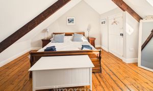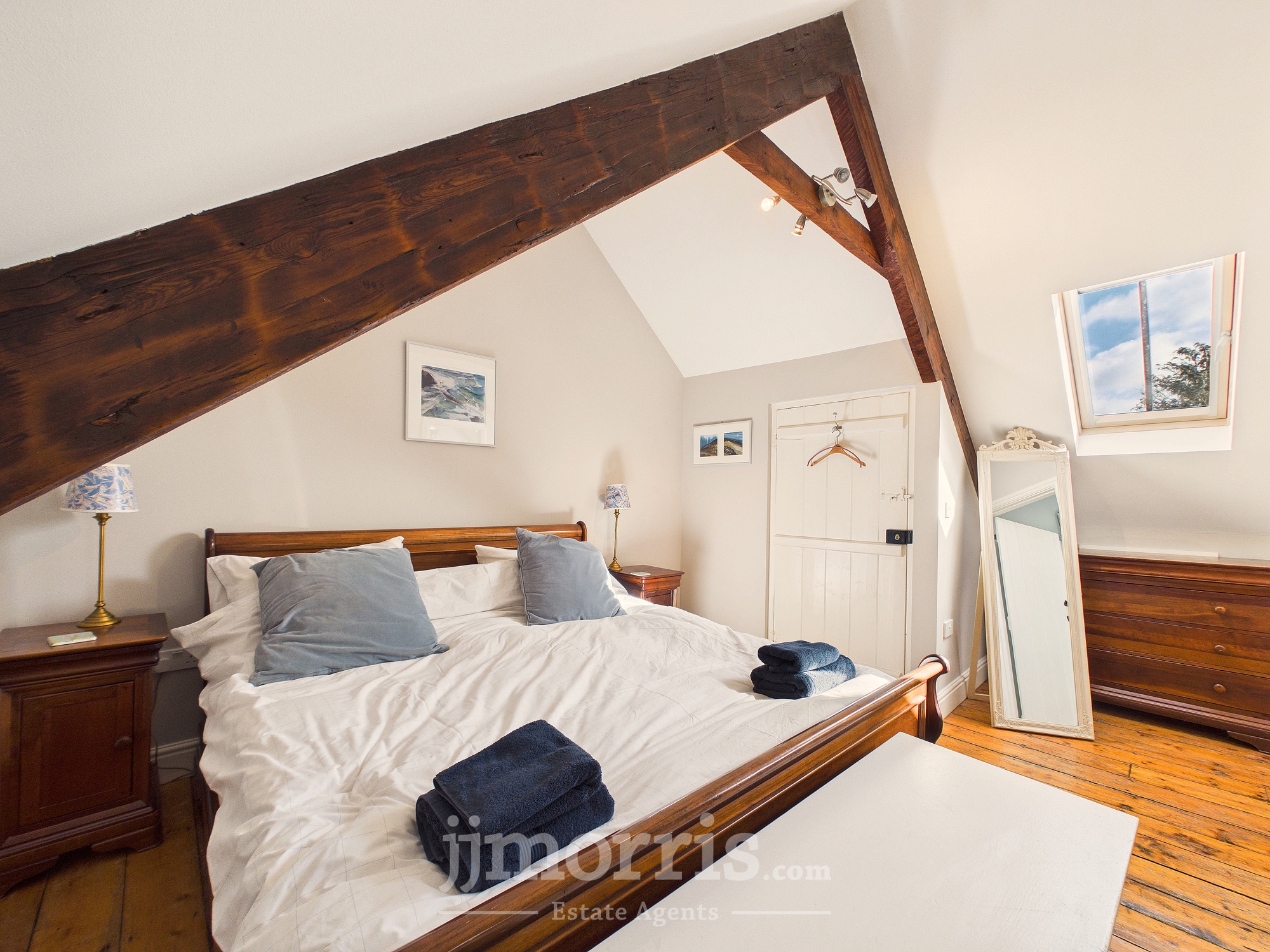(maximum). With exposed "A" frames, Pine floorboards, Velux window with blind, double glazed sash window, double panelled radiator, 4 spotlights, TV point, 10 power points, access to undereaves storage space and door to:-