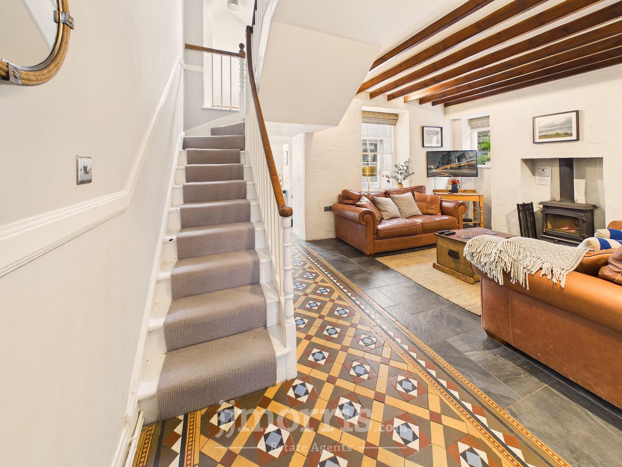 With a mosaic tiled floor and a ceramic tile (slate effect) floor with underfloor heating, Bronze Cast Iron radiator, central heating thermostat control, 3 single glazed windows (one sash), fireplace housing a Woodburning Stove, wiring for Satellite TV, 4 lamp points, 8 power points, open beam ceiling, understairs cupboard with electric light, a small understairs storage cupboard, staircase to First Floor and opening to:-