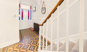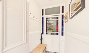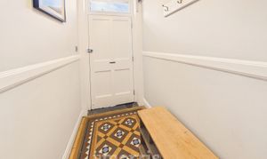 With a mosaic tiled floor, electricity meter and consumer unit, ceiling light, mains smoke detector, coat hooks, dado rail and a half glazed door to:-