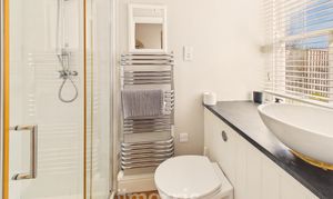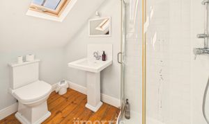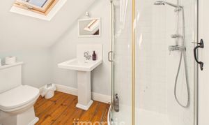 With Pine floorboards, white suite of Wash Hand Basin, WC and a glazed and tiled Quadrant Shower with a Bristan Thermostatic Shower, ceiling light, extractor fan, Velux window, Chrome heated towel rail/radiator, tiled splashback, exposed beam and ceiling light.