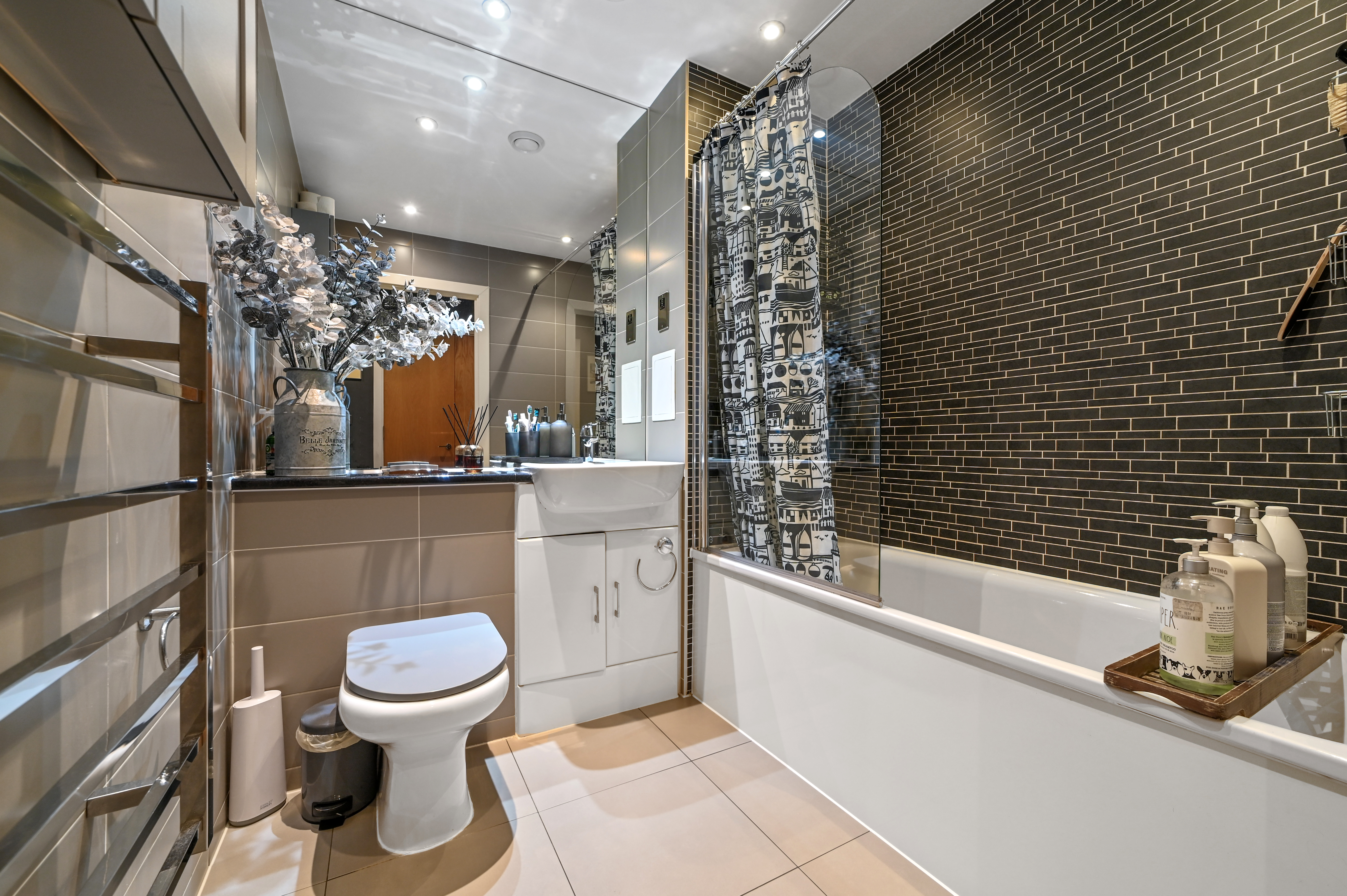 The bathroom features a three-piece white suite including panel enclosed bath with a glass screen and wall mounted shower attachment, low level WC and vanity wash hand basin. It also has a wall mounted ladder style chrome towel rail and tiled flooring.