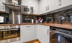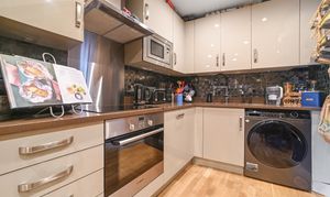 The open-plan kitchen/reception room, which offers an excellent platform for socialising, is at the rear of the property. The double doors opening onto the private balcony provide plenty of natural light and are complimented by the attractive wood flooring. The kitchen is well equipped and has a range of base and eye level units, work surfaces, inset sink with mixer tap, space and plumbing for washing machine, integral fridge freezer and microwave as well as electric oven with overhead extractor hood.