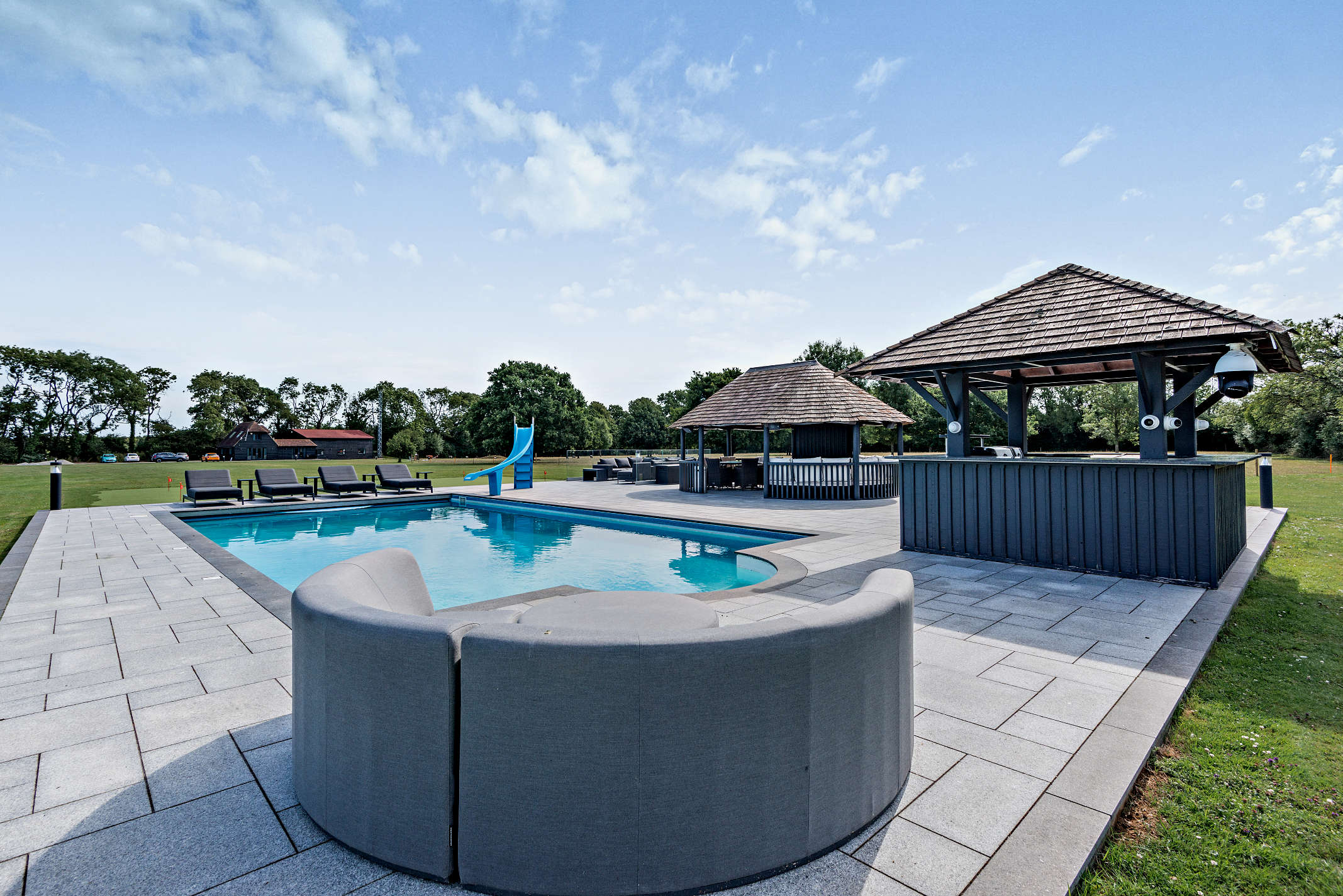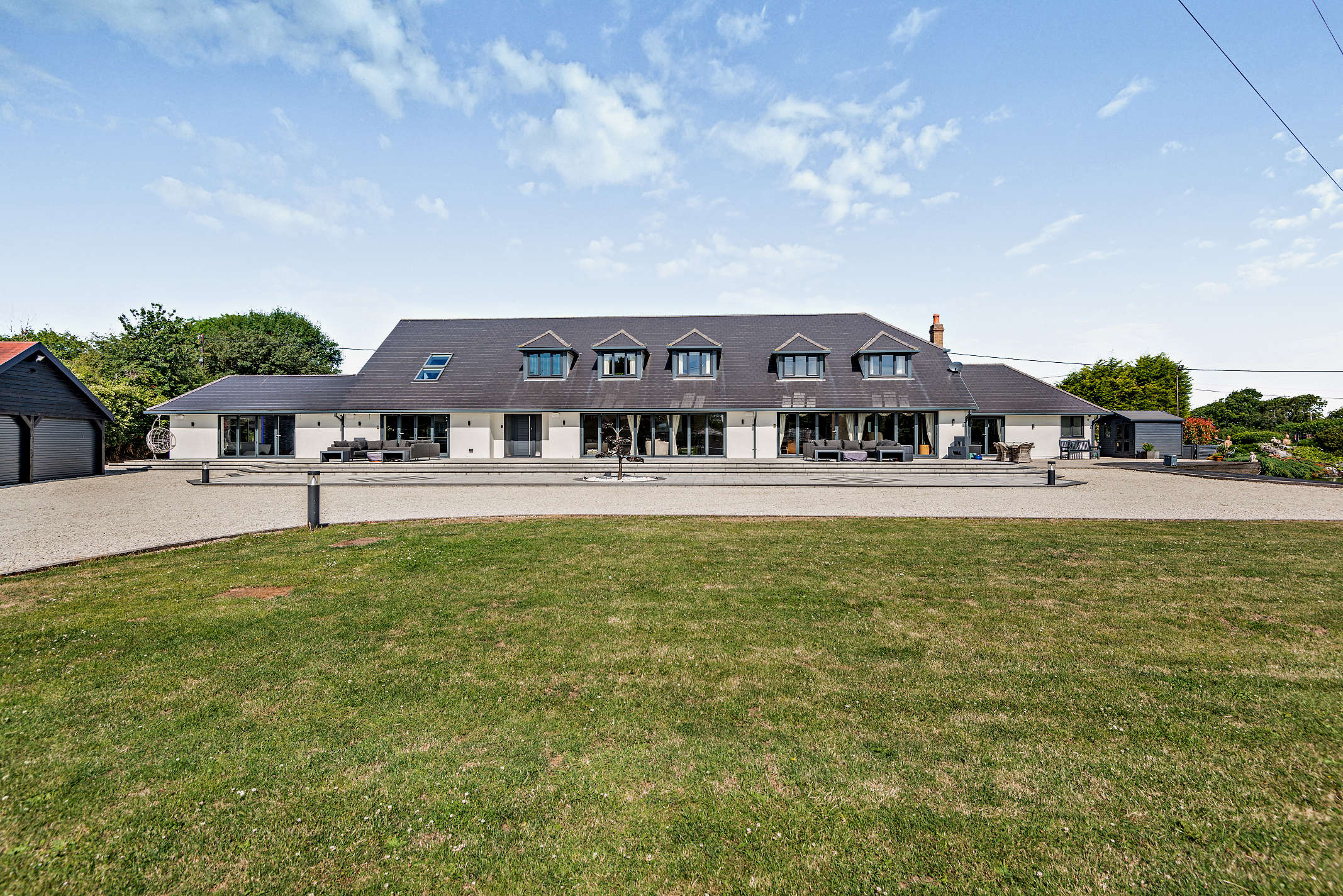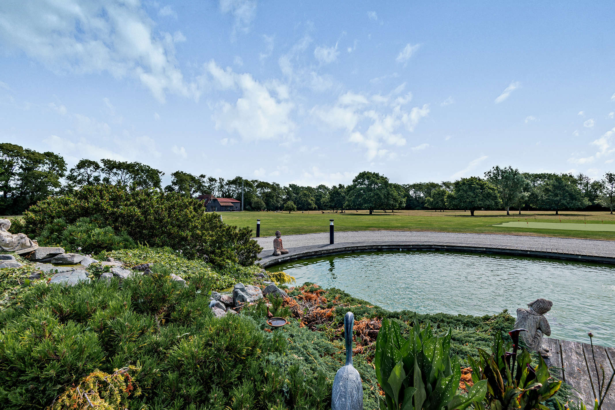 The property is accessed through wrought iron gates leading to a driveway that reaches the rear of the property, the garages, and various outbuildings. A second gate opens to the front of the property. The estate spans approximately 8.4 acres, featuring landscaped gardens, an outdoor swimming pool with surrounding terraces, and an outdoor kitchen. To the north of the main house is a charming rockery garden next to a carp pond with a decked area and terrace.