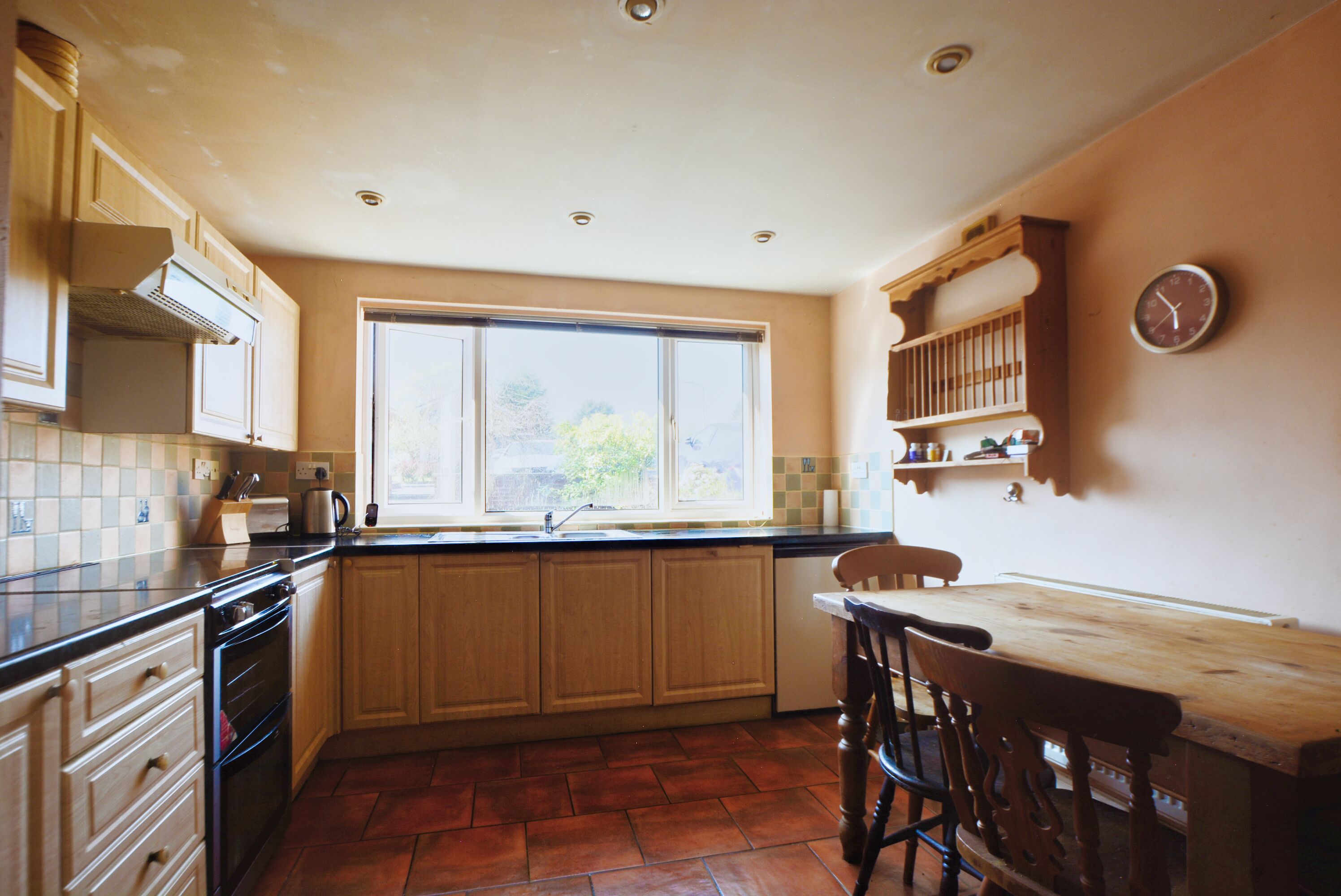 Maximum measurements. With double glazed window to the front elevation, double glazed door to the side elevation, quarry effect ceramic tiled floor, a range of wall and base units with work surface over, stainless steel sink, drainer and mixer tap, part tiled walls, space for gas cooker, extractor hood, space for fridge freezer, spotlights, radiator.