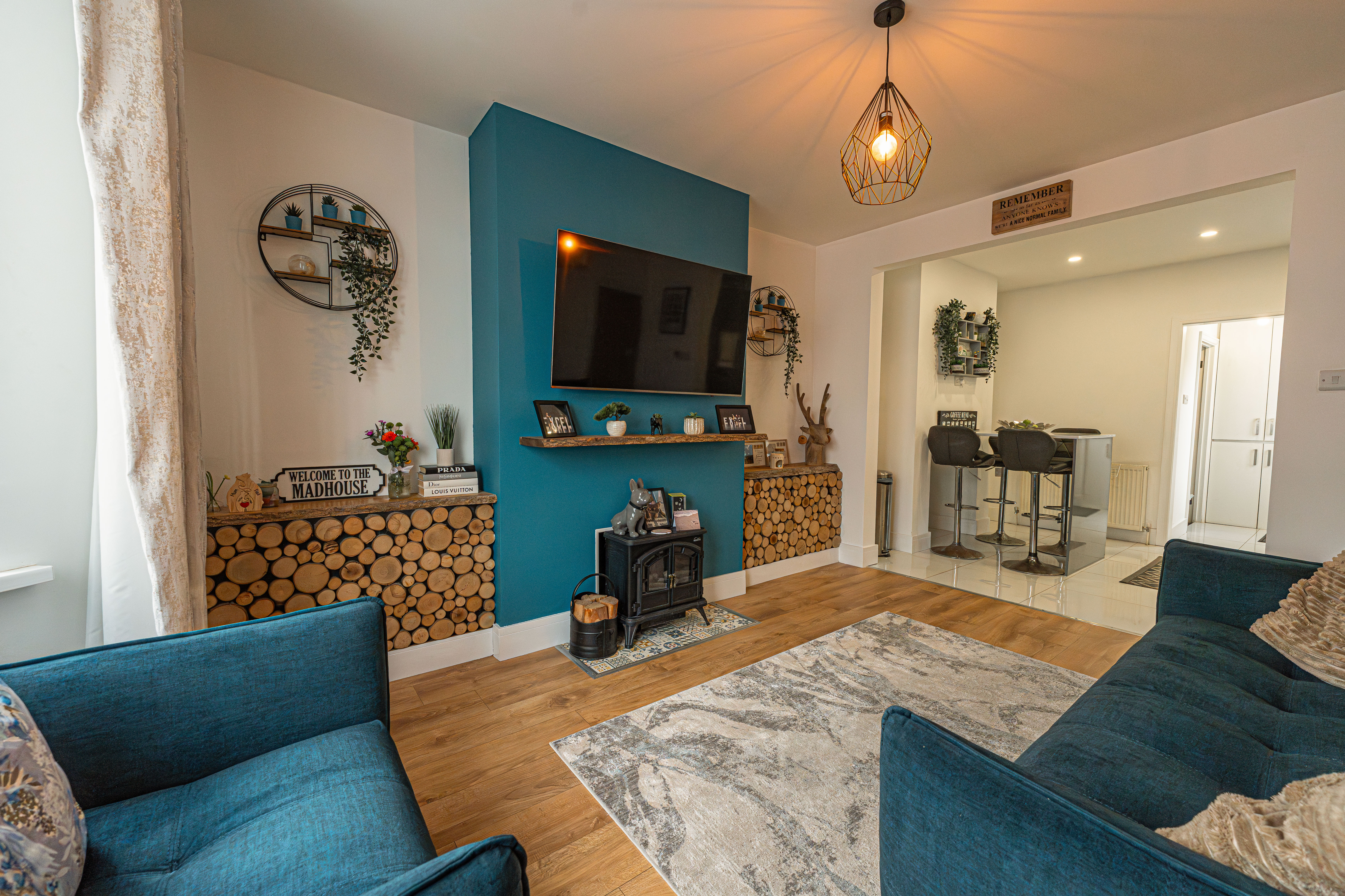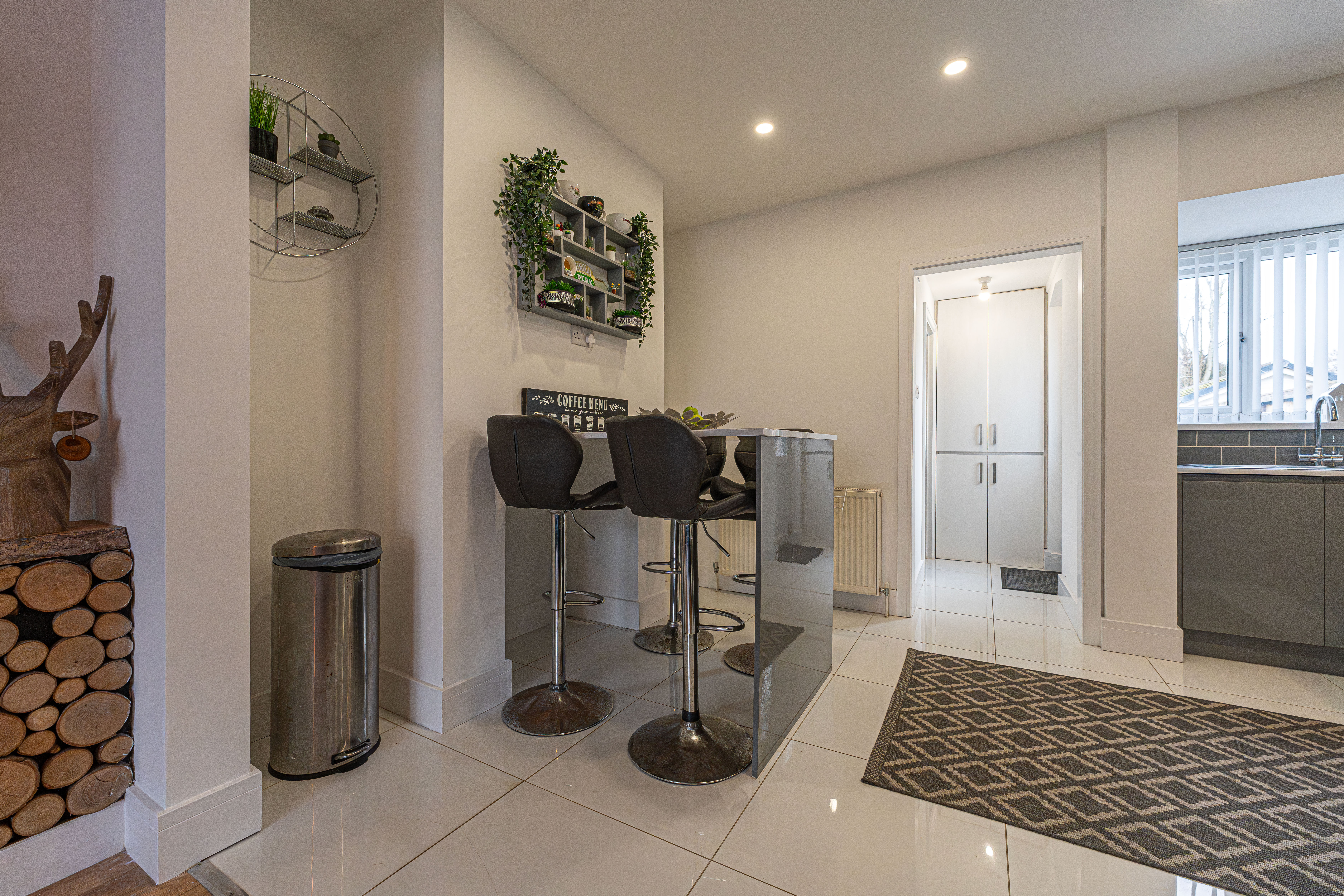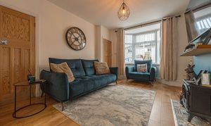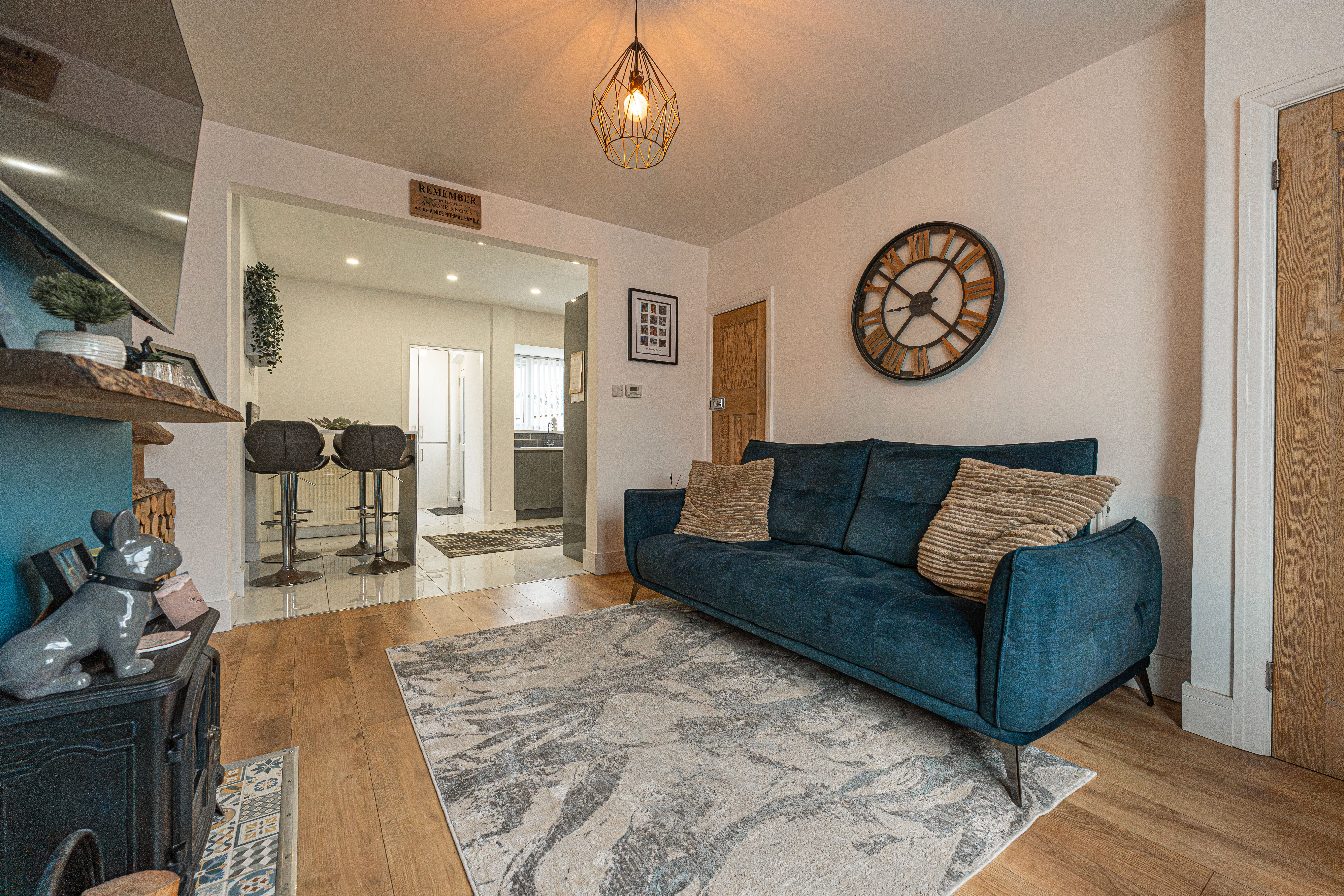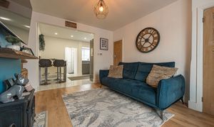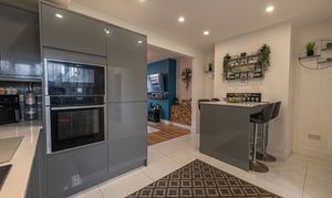 This beautifully presented family home been lovingly renovated by the current owners over a number of years, offering a high standard of living perfect for professionals and growing families. Upon entry to the property we are welcomed in to the spacious living room, which features a flood of light from bay-fronted windows, providing a bright and inviting atmosphere for this relaxing family space. The lounge also features an understairs storage closet and an open plan walkway to the kitchen and dining room beyond, which showcases a stylish modern design, offering glossy units for ample storage, and a wide range of high-end appliances integrated into the worktop. The kitchen features a kitchen island with breakfast bar for easy dining options, as well as a hallway beyond which can access a helpful utility closet, a doorway to the garden, and an impressive walk-in shower room boasting a sleek design.