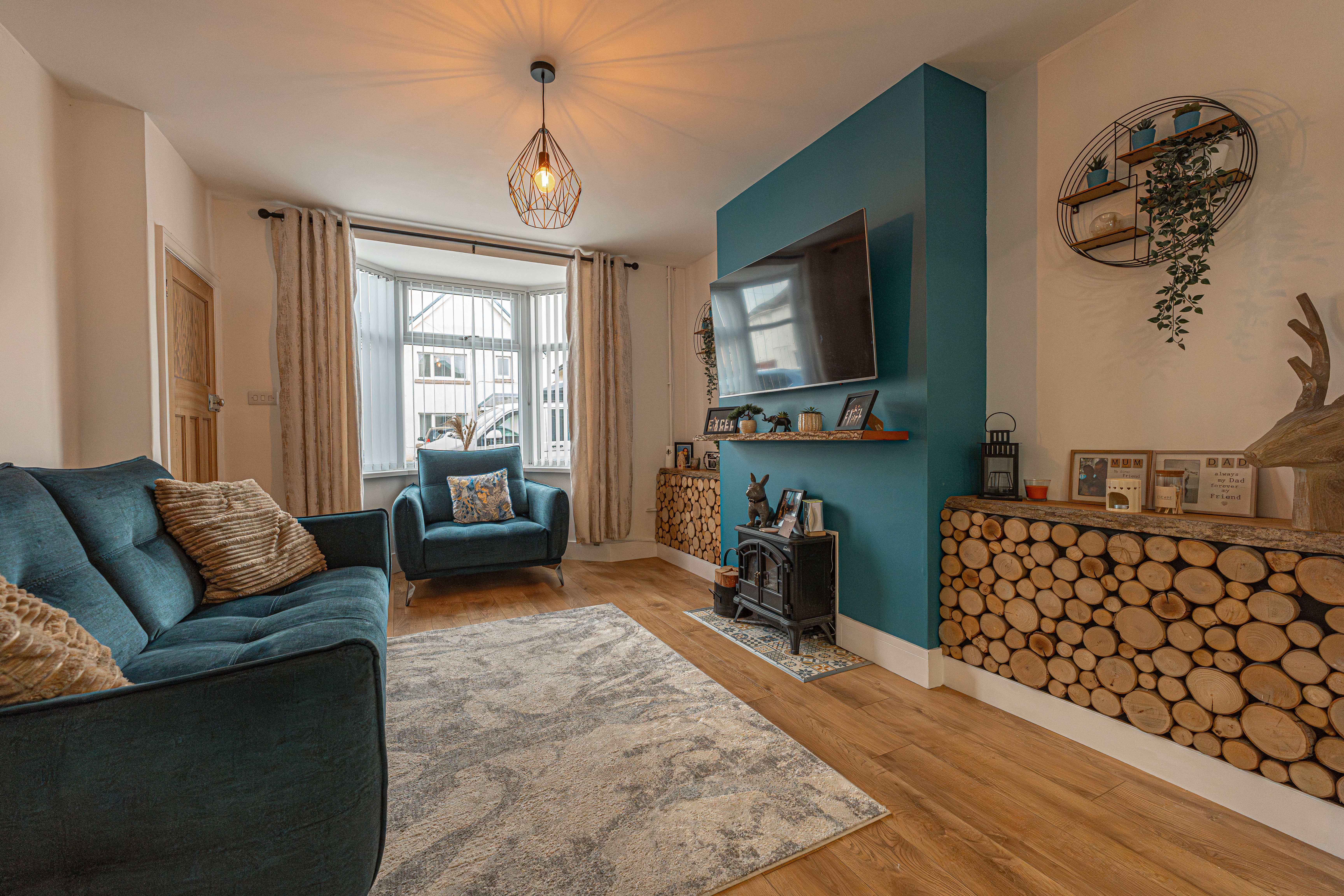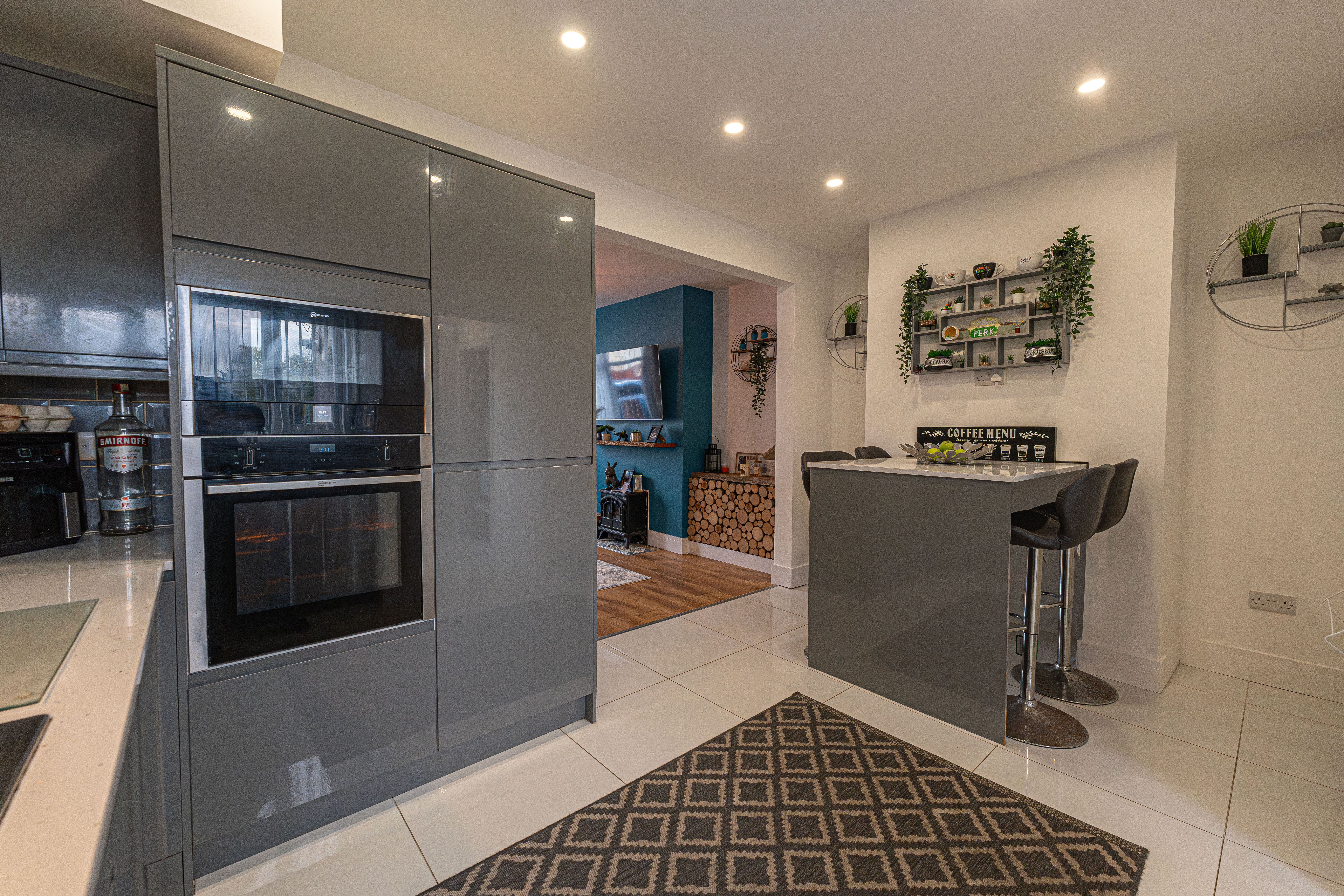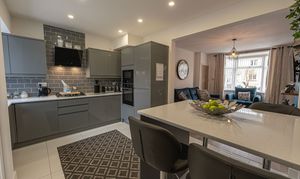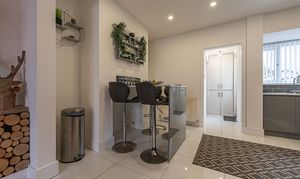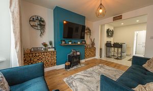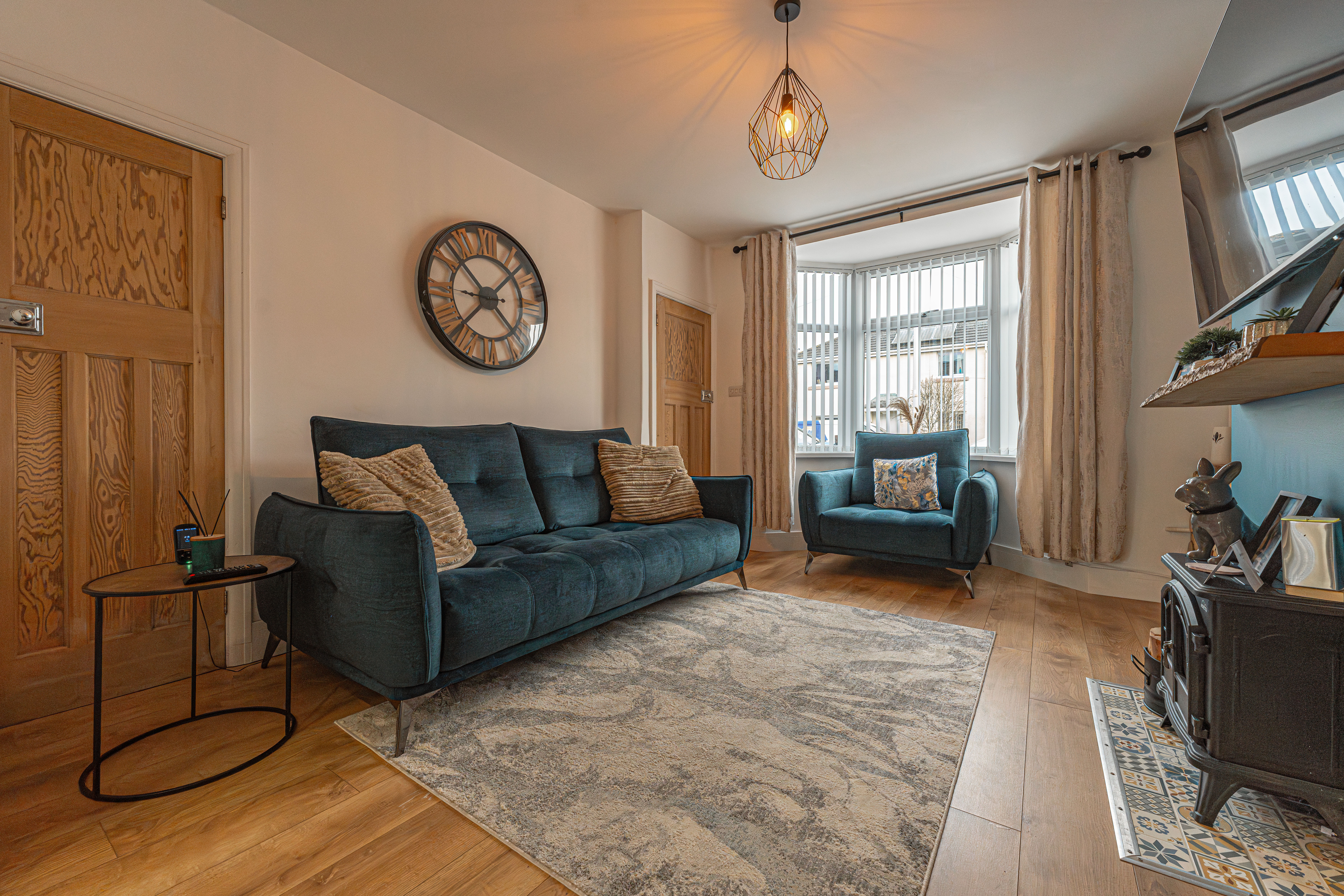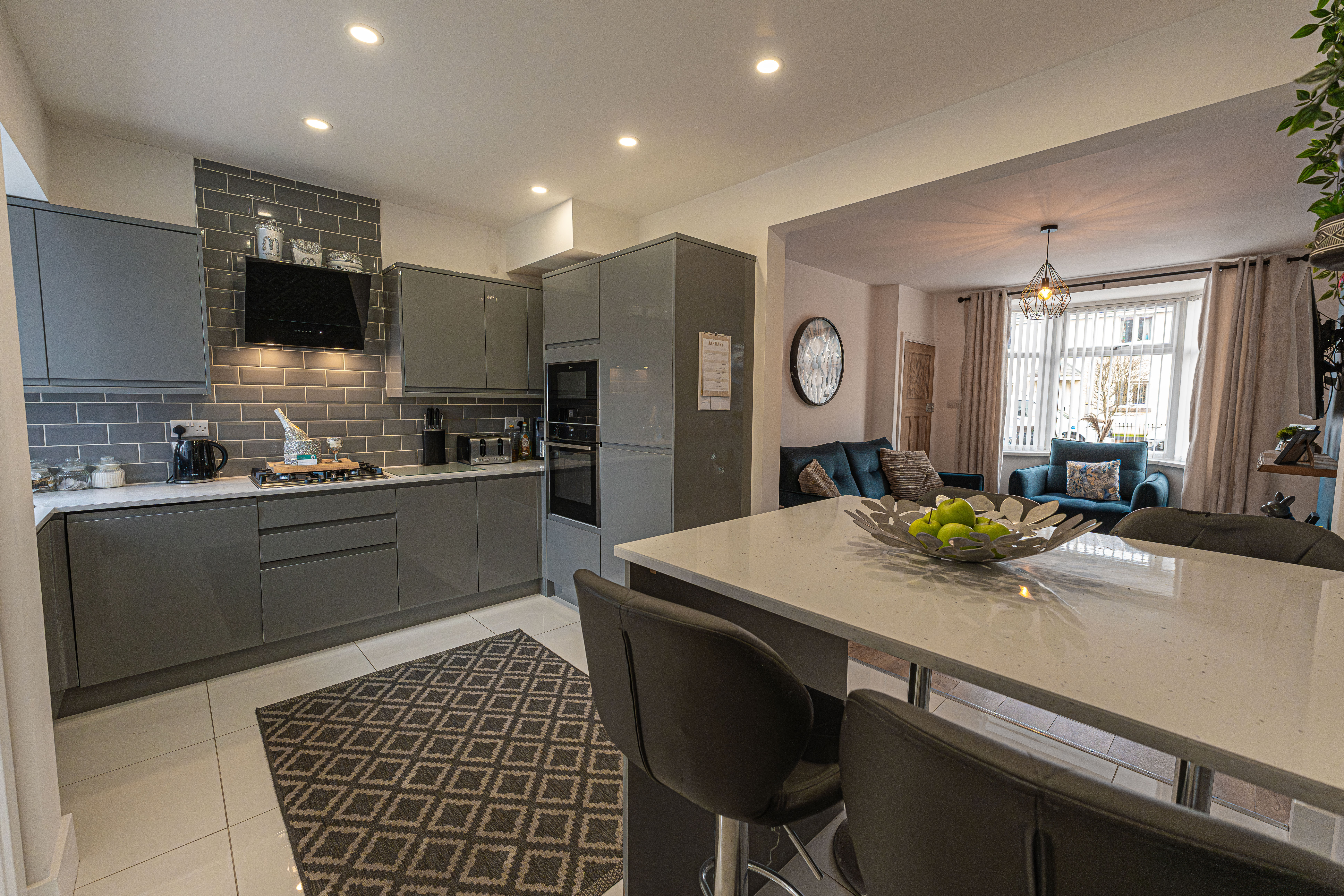This beautifully presented family home been lovingly renovated by the current owners over a number of years, offering a high standard of living perfect for professionals and growing families. Upon entry to the property we are welcomed in to the spacious living room, which features a flood of light from bay-fronted windows, providing a bright and inviting atmosphere for this relaxing family space. The lounge also features an understairs storage closet and an open plan walkway to the kitchen and dining room beyond, which showcases a stylish modern design, offering glossy units for ample storage, and a wide range of high-end appliances integrated into the worktop. The kitchen features a kitchen island with breakfast bar for easy dining options, as well as a hallway beyond which can access a helpful utility closet, a doorway to the garden, and an impressive walk-in shower room boasting a sleek design.
