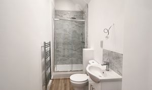 - Shower room including vanity wash basin and shower with rainfall attachment