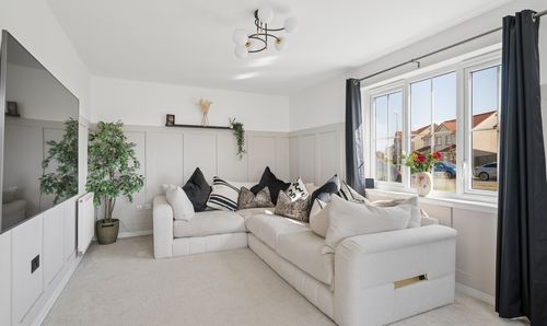 To your right, the spacious lounge continues this neutral theme, feeling bright and inviting thanks to dual-aspect windows that allow natural light to flood the room.