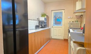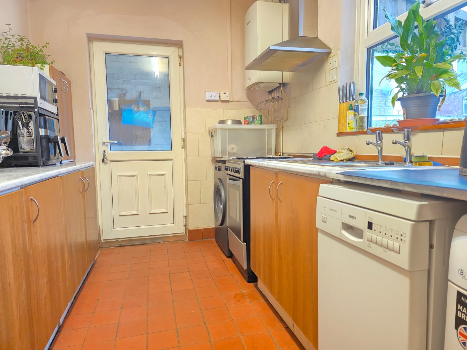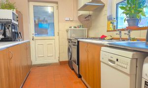 This includes a number of base units with rollover worktop, stainless steel sink and drainer with mixer tap, space for an American style fridge/freezer, space and plumbing for a dishwasher and washing machine, space for a gas cooker, extractor hood, wall mount boiler unit, UPVC double glazed window, original terracotta flooring, tiled splashbacks and access out to the rear porch.