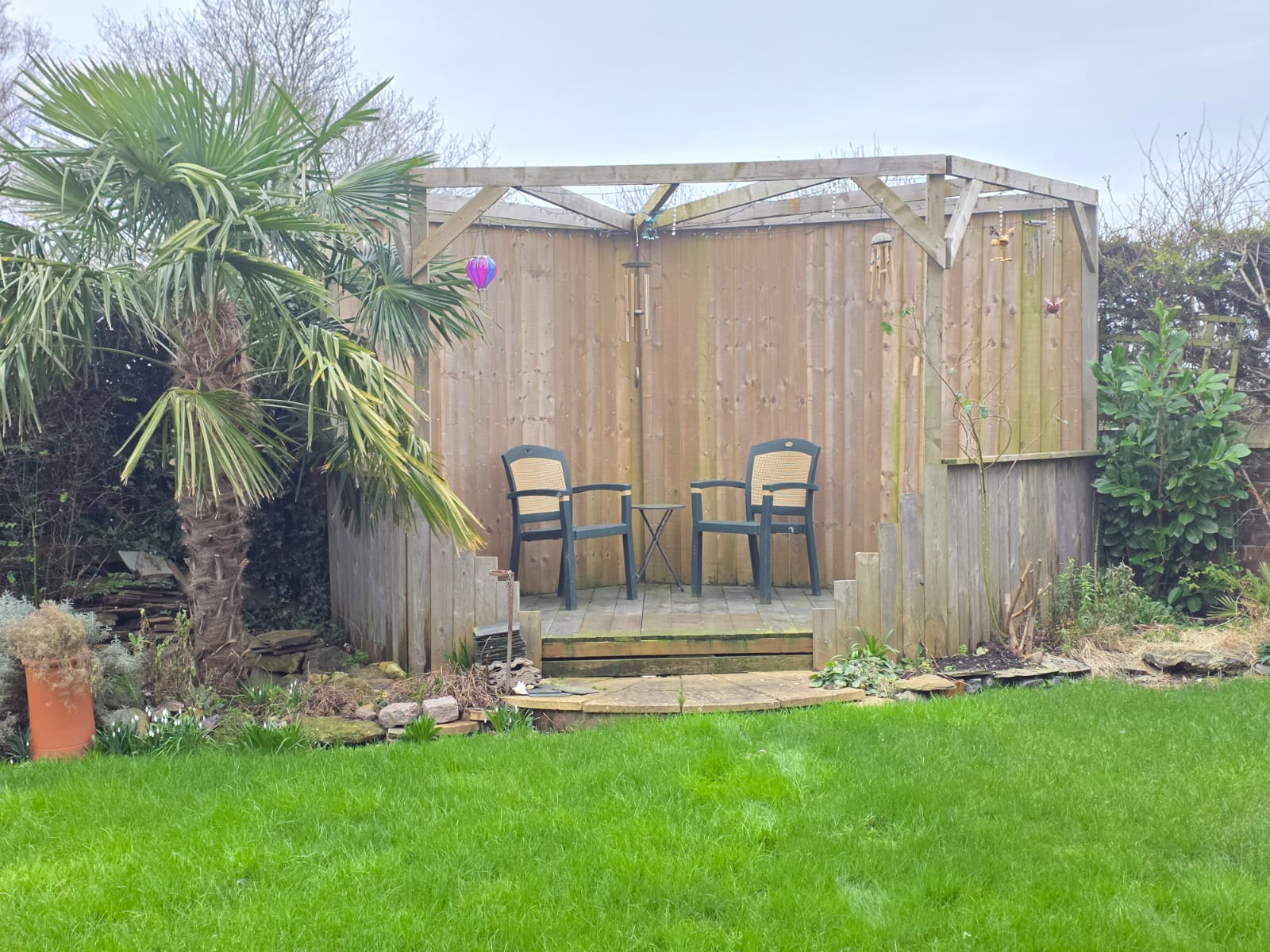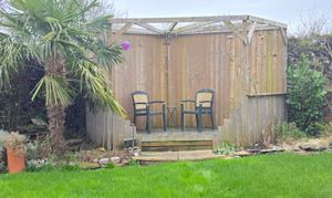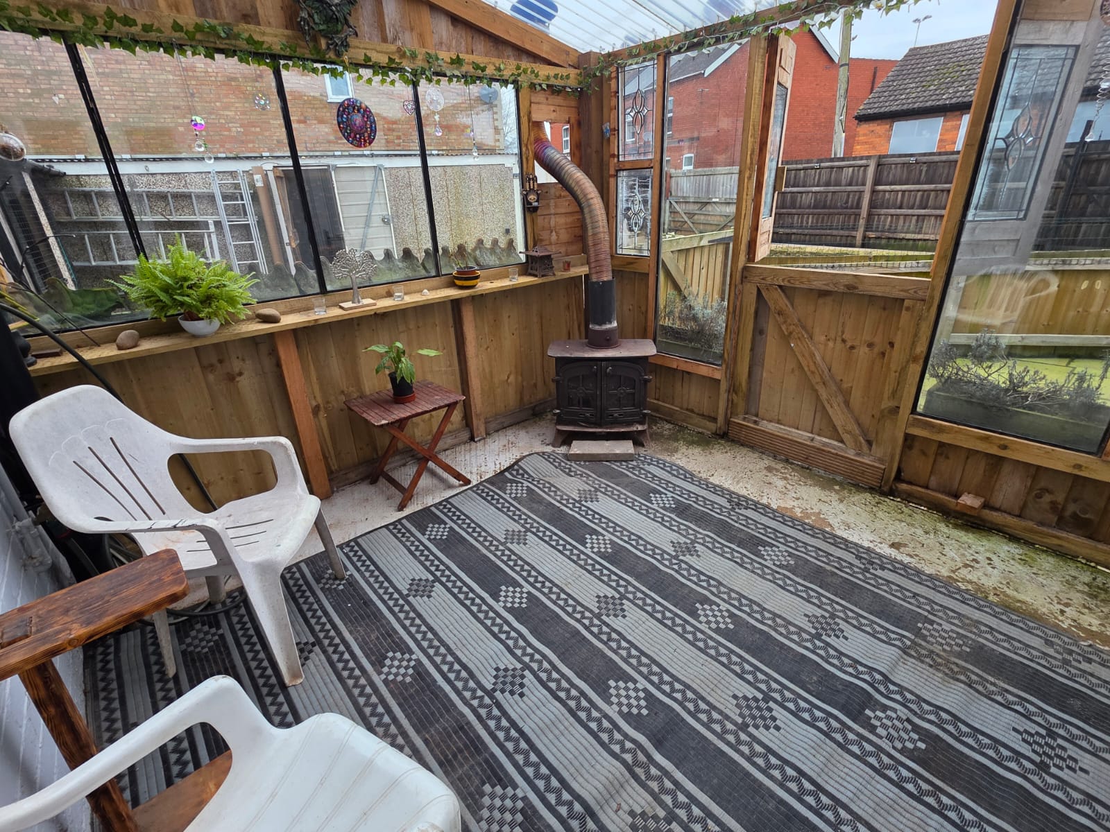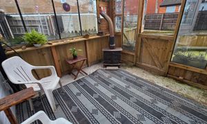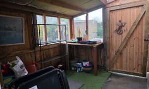 This wood constructed lean to includes concrete flooring, log-burner, windows and access round to the potting shed.