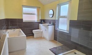 This renovated bathroom includes a walk-in shower cubicle, panel bath, vanity unit with integrated low level flush WC, wash hand basin with mixer tap, radiator, part tiled walls, extractor and two UPVC double glazed window.