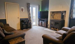 The lounge includes carpet flooring, TV connectivity, large log burner with stove, UPVC double glazed window, access into the lean to and kitchen plus stair case leading to the first floor.