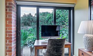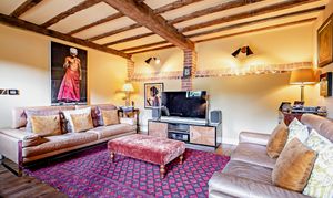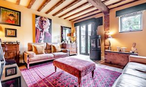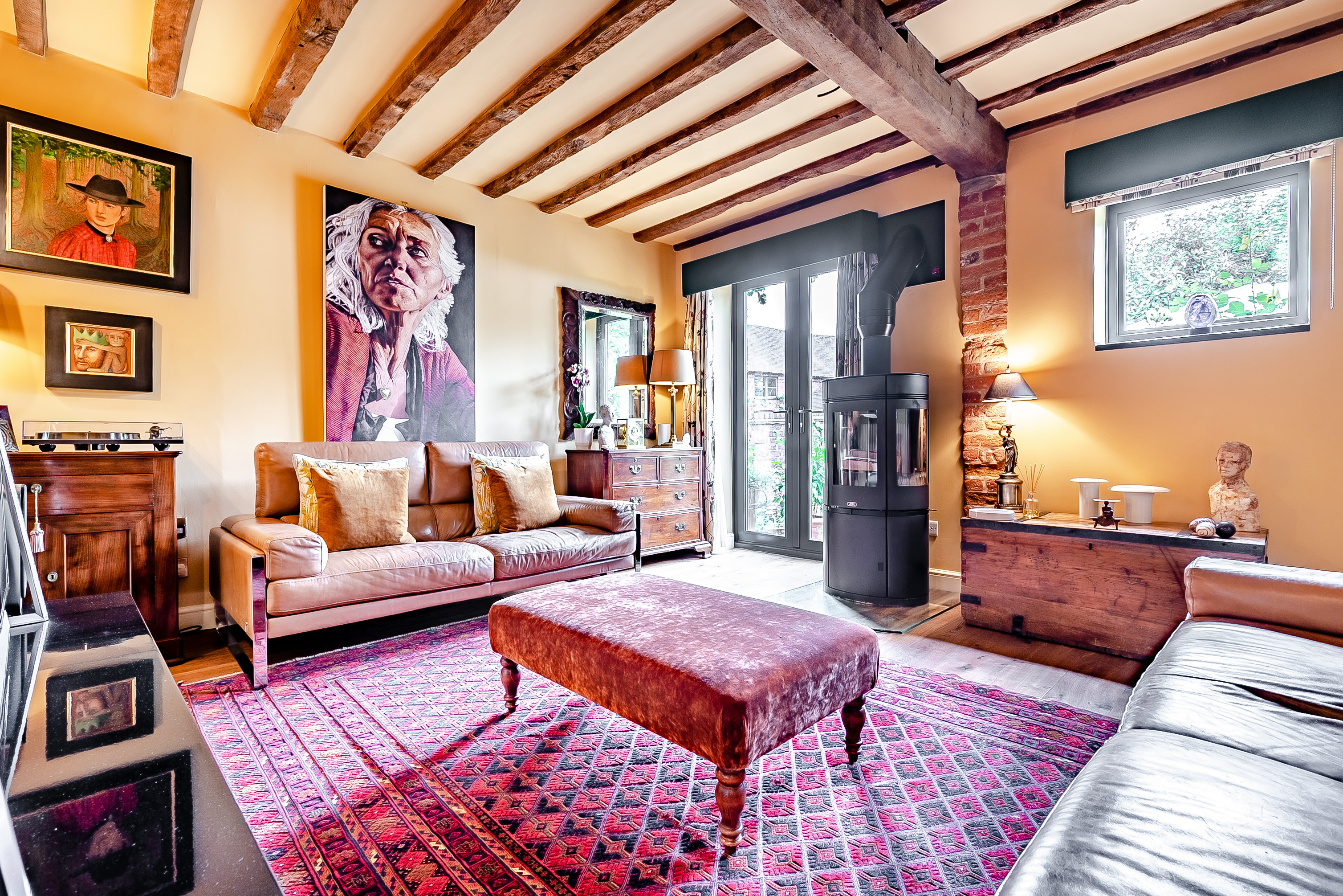 The sitting room boasts a high ceiling with exposed timbers and French doors which create the feeling of space and light. An ABX wood burner creates a cozy focal point, while the French doors open to the beautiful patio and garden.