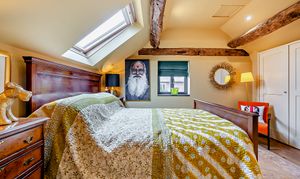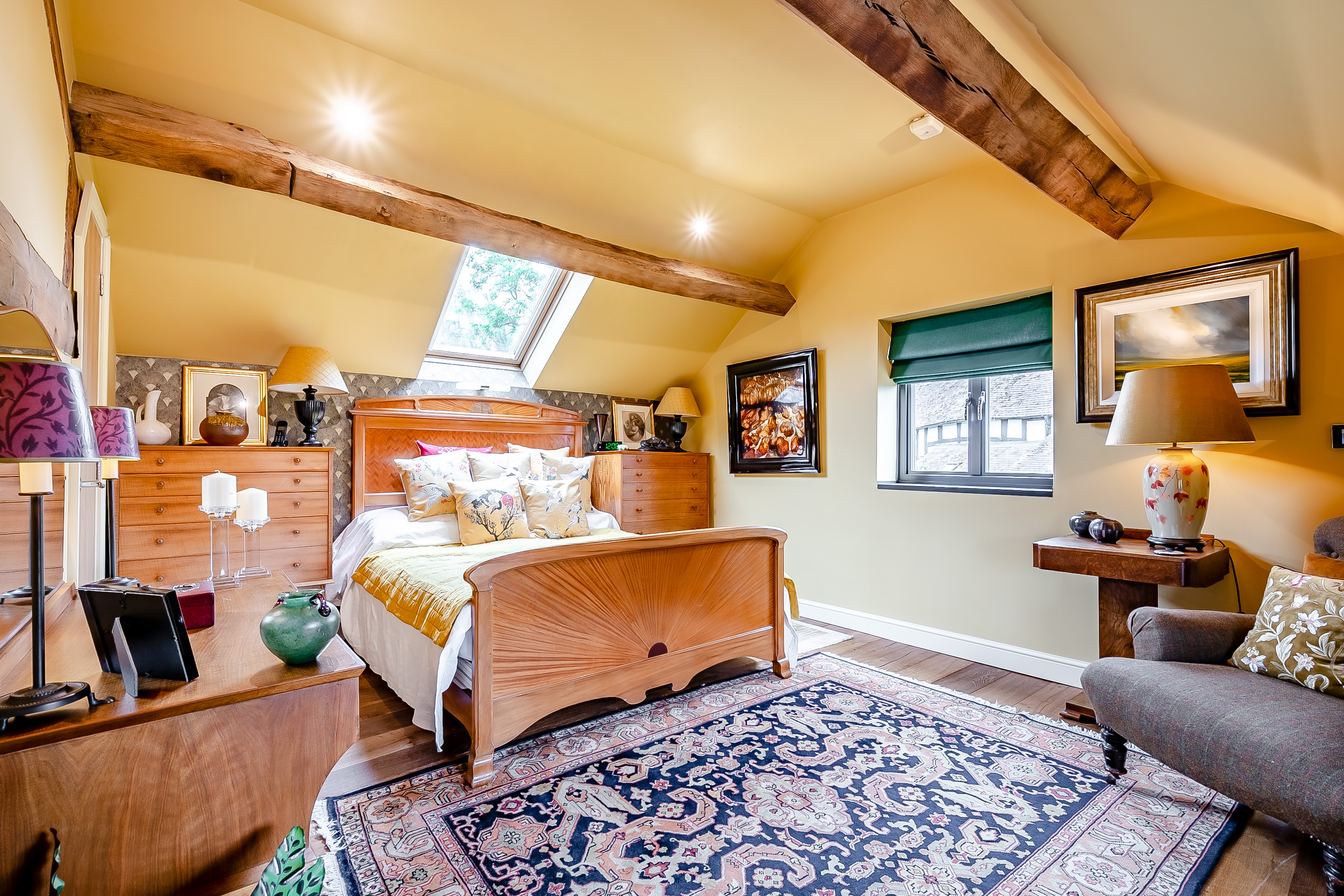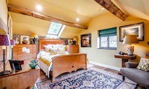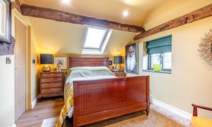 This bedroom benefits from double aspect windows, built in wardrobes and exposed beams, adding to its charm.