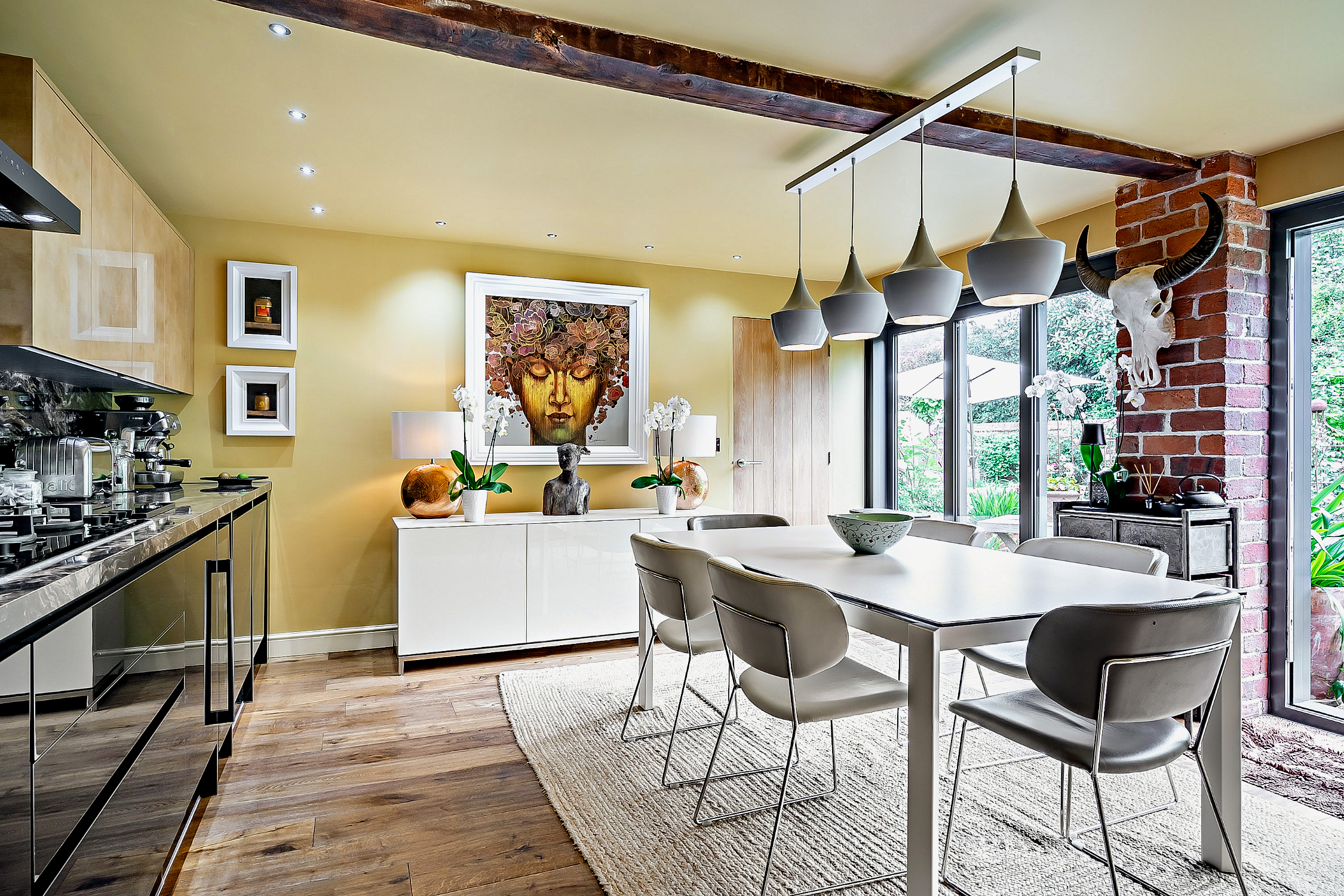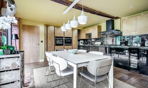 The kitchen is equipped with recently fitted base and wall units. It includes integrated NEFF appliances, a wine cooler and a 5 ring Bertazonni LPG hob and a Bertazonni extractor fan. Additional features include an engineered oak floor, exposed bricks and beams, and sliding doors looking over the patio and garden.