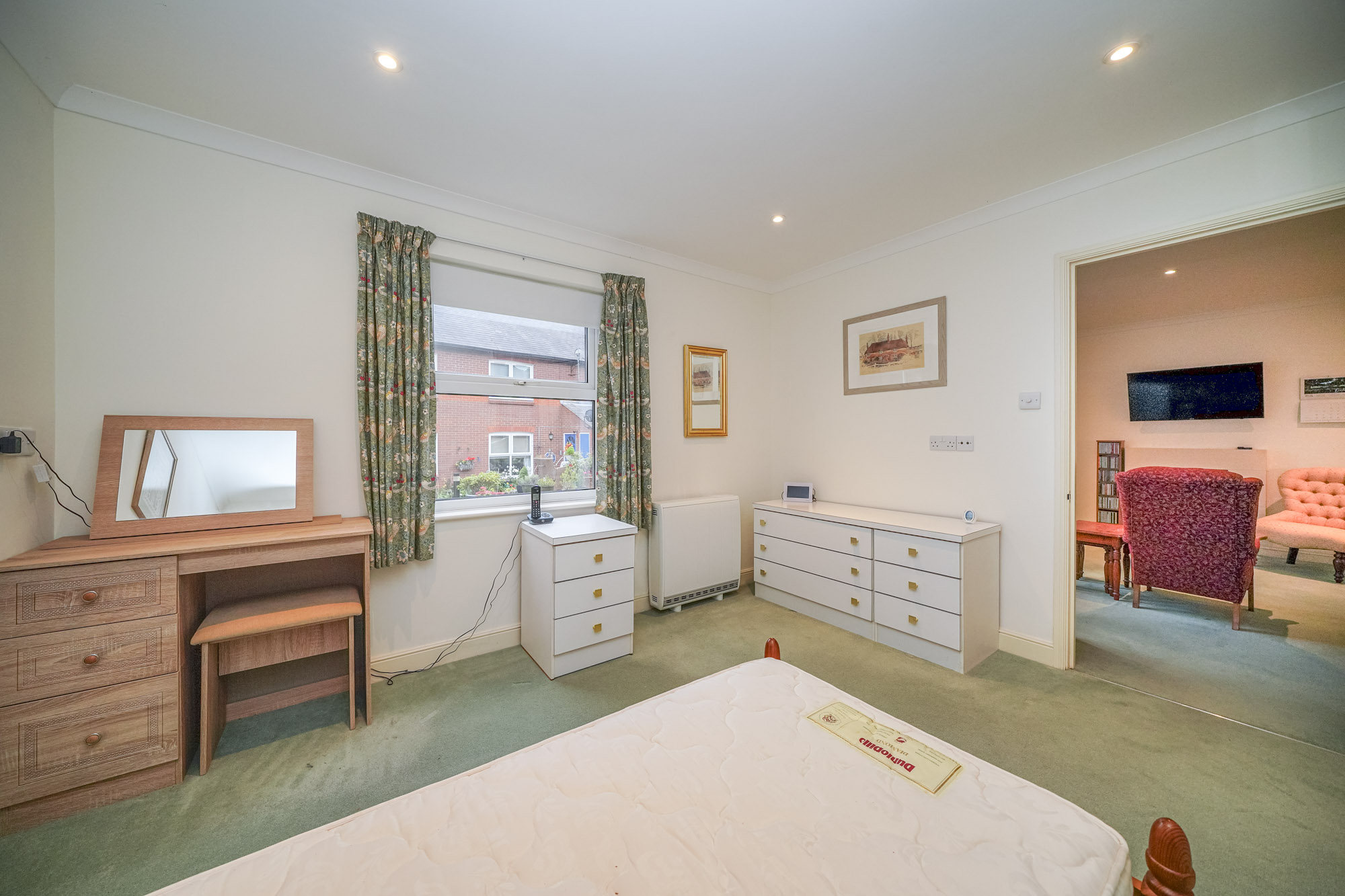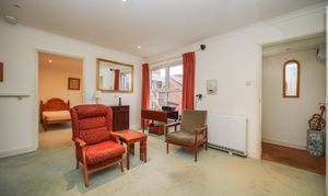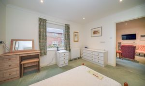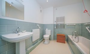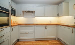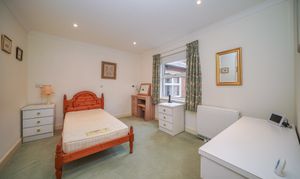 Accessed from the sitting room, the master bedroom is a generous double featuring built-in storage and pleasant views over the communal gardens. Adjacent to the bedroom, the spacious bathroom has been recently updated and includes a low-level bath with handrails and a heated towel rail.