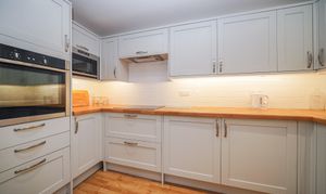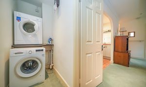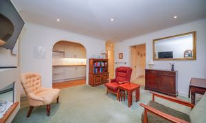 This property is offered for sale with no onward chain and provides spacious, well-presented accommodation. The open-plan living area features a modern remote-controlled flame-effect electric fire, creating a cosy and contemporary feel, and a delightful outlook over the communal gardens. The modern fitted kitchen is equipped with an electric hob, eye-level oven, integrated microwave, and under-counter fridge and freezer, and a water softener. A utility/storage room houses a washing machine and tumble dryer for added convenience.
