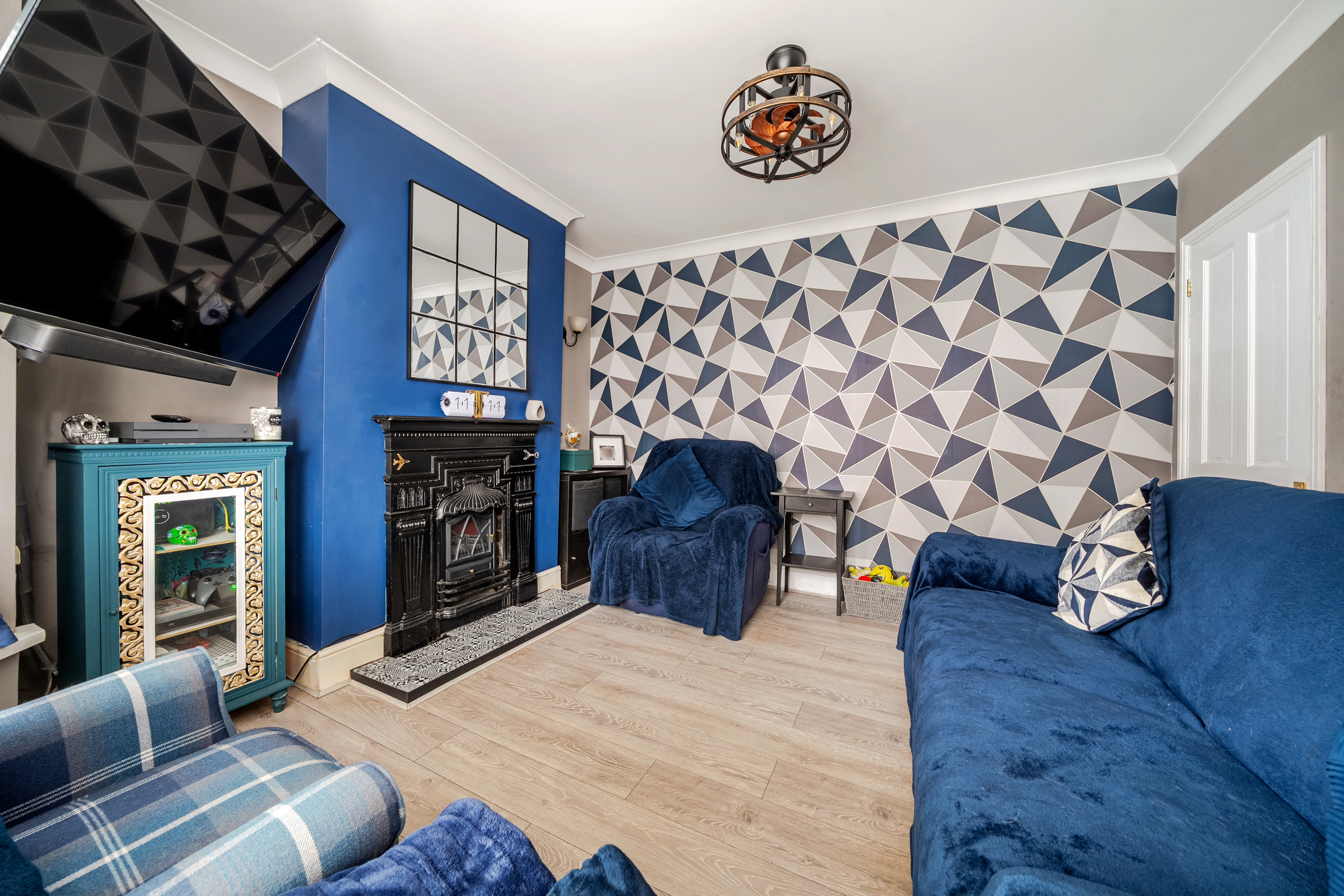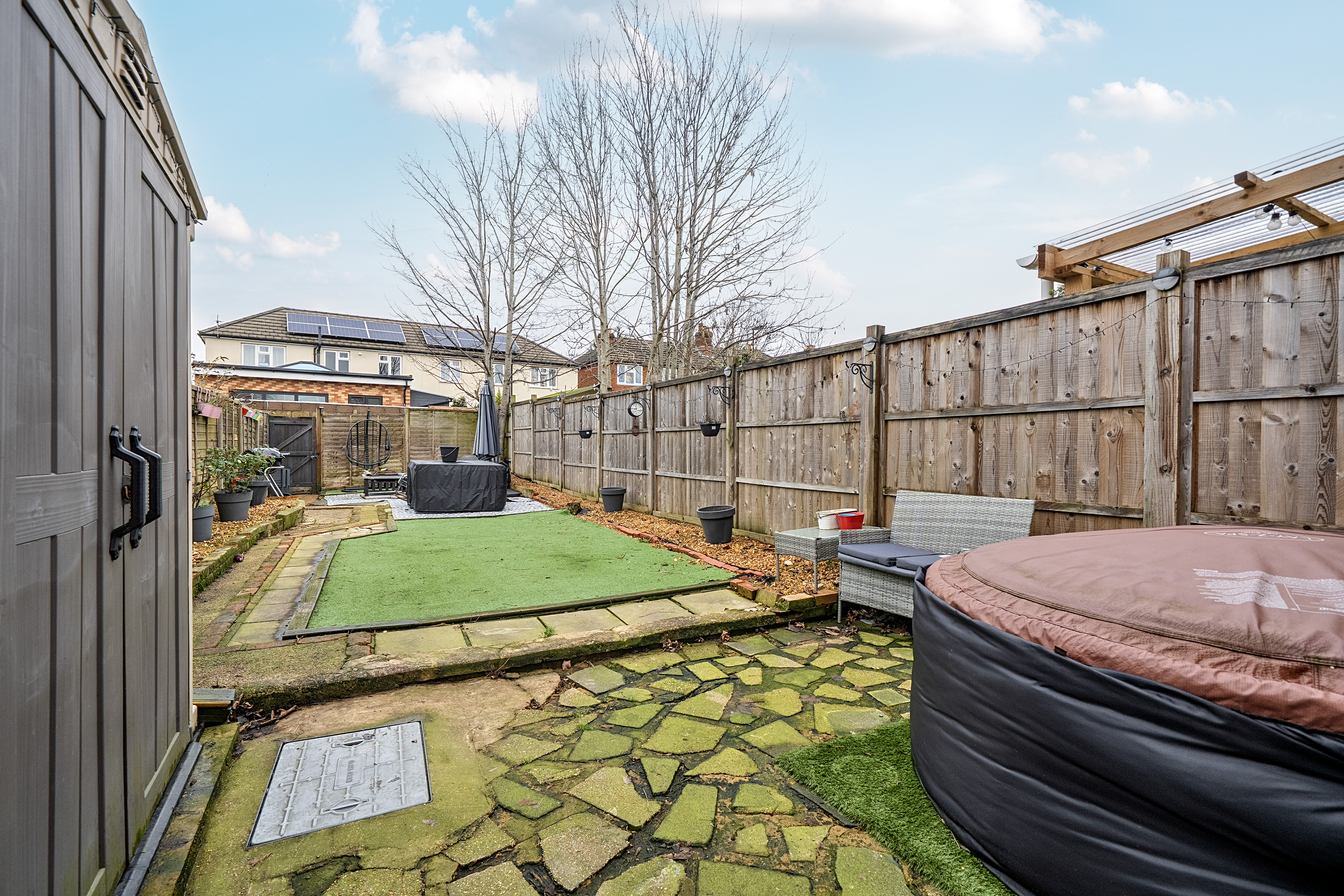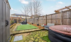 The rear garden has been designed with low maintenance in mind. It is mainly paved and includes an astro-turfed area, making it ideal for family activities, pets, or relaxing outdoors. A gate at the far end of the garden provides convenient access, adding to the practicality of the outdoor space.