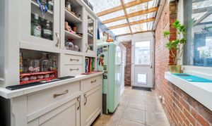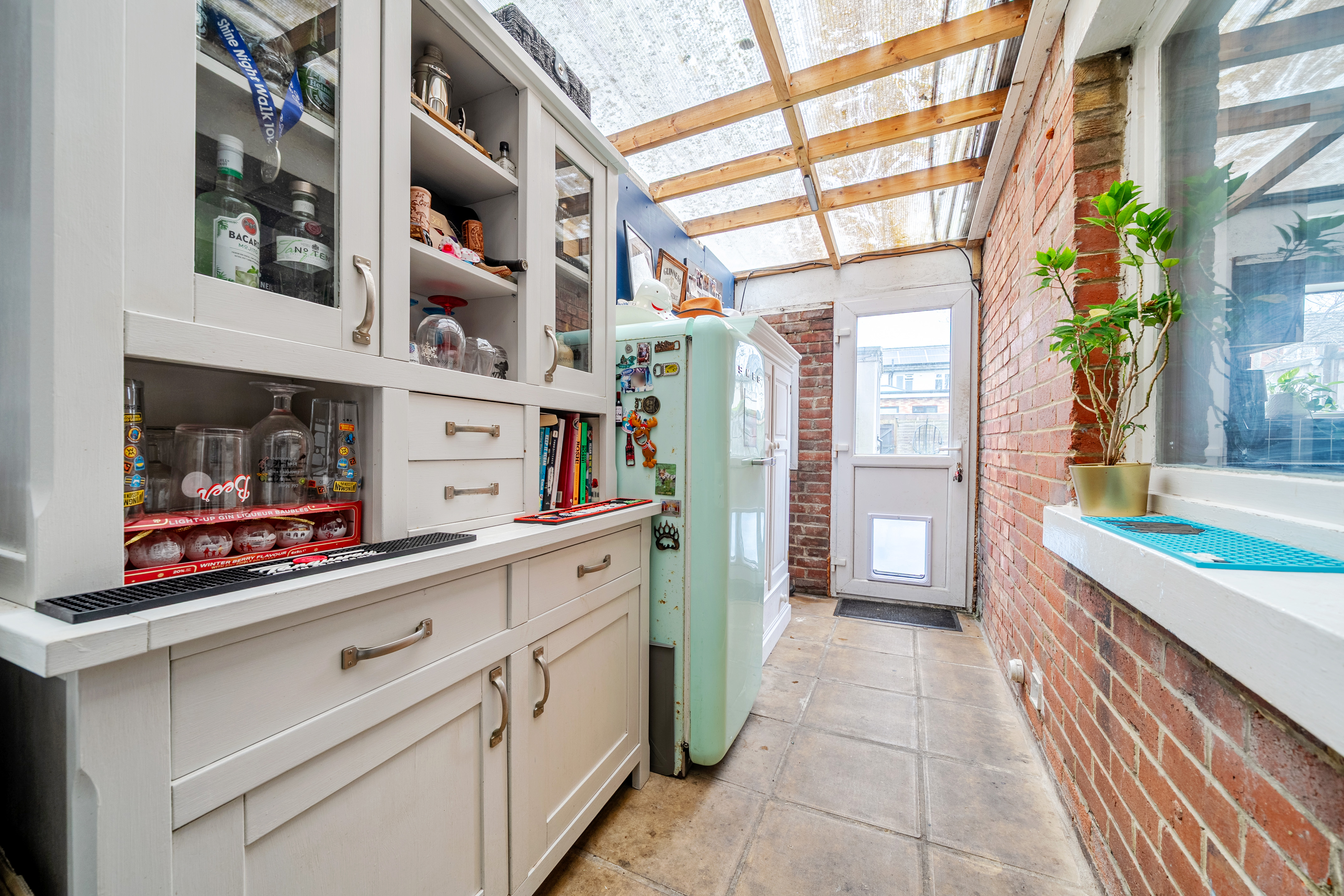 The kitchen breakfast room is fitted with a range of base and wall units, tiled splashbacks, a built-in double oven, gas hob, and extractor hood. A side door opens into a versatile lean-to, which can be used as extra storage, a cosy reading area, or a home bar. This adaptable space adds further appeal for families seeking practical solutions and additional living areas.